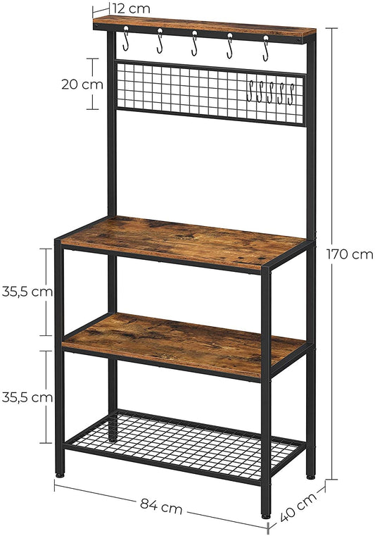 Industrial Kitchen Baker's Rack with Storage Shelves 10 Hooks and Metal Mesh Shelf 84 x 40 x 170 cm Rustic Brown