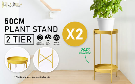 La Bella 2 Set 50cm Gold Plant Stand Planter Shelf Rack 2 Tier Steel