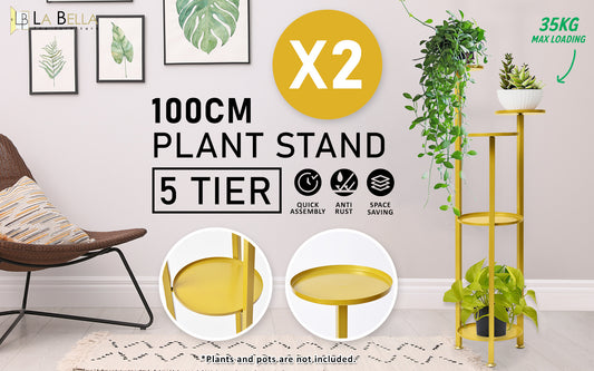 La Bella 2 Set 100cm Gold Plant Stand Planter Shelf Rack 5 Tier Steel