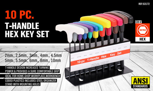 10-Piece T-Handle Hex Key Set, Allen Wrench Metric Sizes 2mm-10mm, Heat-Treated Steel with Color-Code Organizer Stand