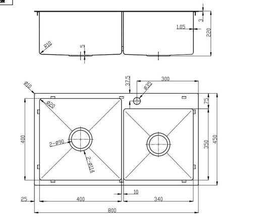 2023 Double Burnished brushed stainless steel kitchen sink hand trough 800*450*220 mm with tap hole