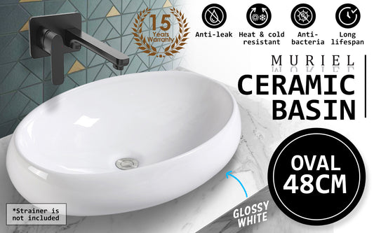 Muriel 48 x 34 x 14.5cm White Ceramic Bathroom Basin Vanity Sink Oval Above Counter Top Mount Bowl