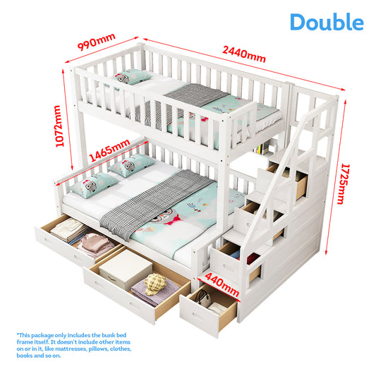 Mason Taylor Bunk Bed Frame Solid Pine Timber Safety Rails Big Storage - White - DOUBLE