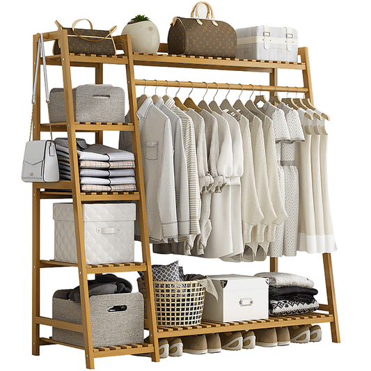 Portable Clothes Rack Coat Garment Stand Bamboo Rail Hanger Airer Closet