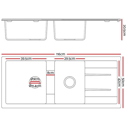 Cefito Stone Kitchen Sink 1160X500MM Granite Under/Topmount Basin Double Bowl Black