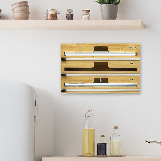 3 Grids Bamboo Food Wrap Dispenser Cutter Foil Cling Film Storage Holder Box Kitchen