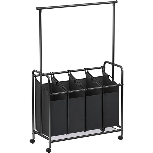 SONGMICS 4-Bag Laundry Sorter Rolling Cart with Hanging Bar Heavy-Duty Wheels Black RLS44B