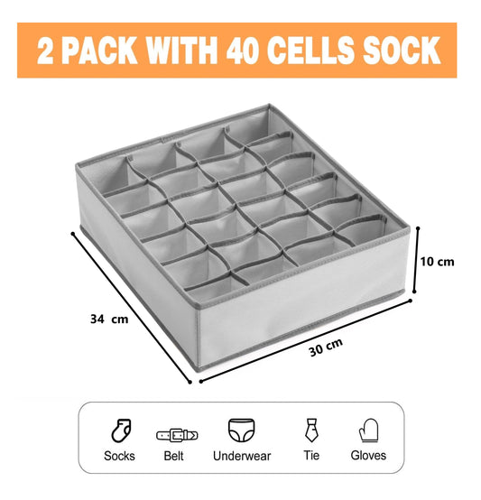 Set of 2 Fabric Drawer Organizer Divider Storage Boxes for Storing Socks, Underwear, Ties, Scarves (Grey)