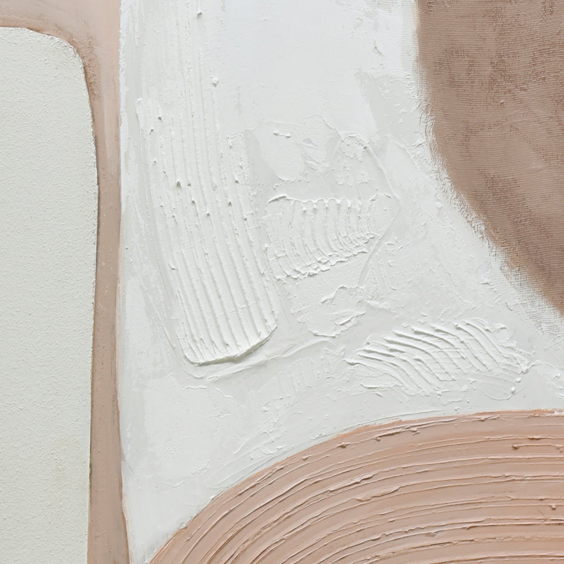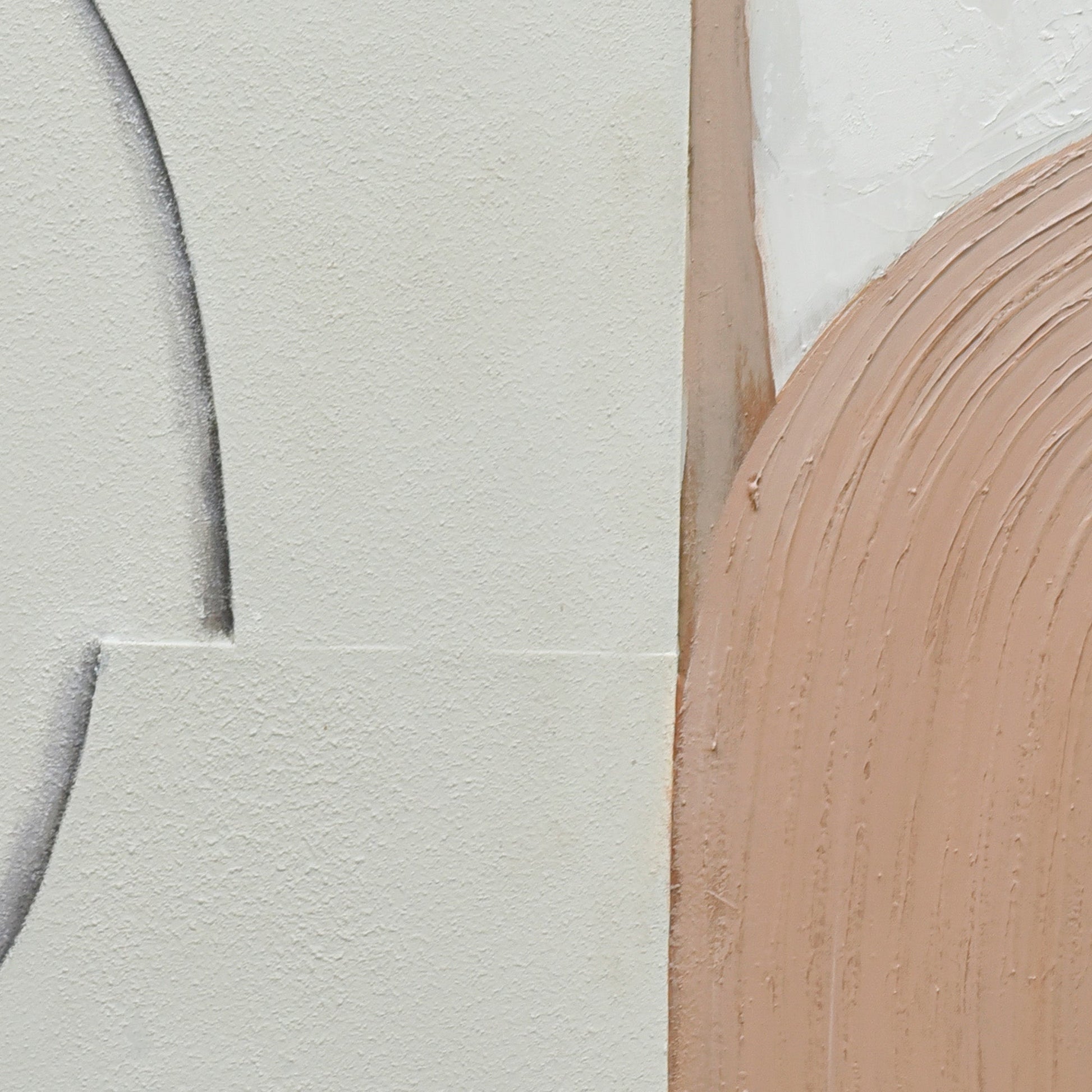 "Duality Dance" captures the essence of contrasting elements harmoniously coexisting on a single canvas. On the left, a semi-circular 3D expanse rests on a pristine white background, its border boldly defined by jet black, signifying strength and stability. The right side introduces a delicate interplay of white and pastel, bringing forth a sense of serenity and grace. This duality is accentuated by a uniquely grooved, U-shaped texture on the bottom right, adding depth and intrigue to the composition. Each stroke, meticulously hand-painted with 3D materials, invites viewers to experience the artwork both visually and tactilely. Encased within a champagne-hued frame, "Duality Dance" stands as a testament to the beauty of balance and the dance between strength and softness.