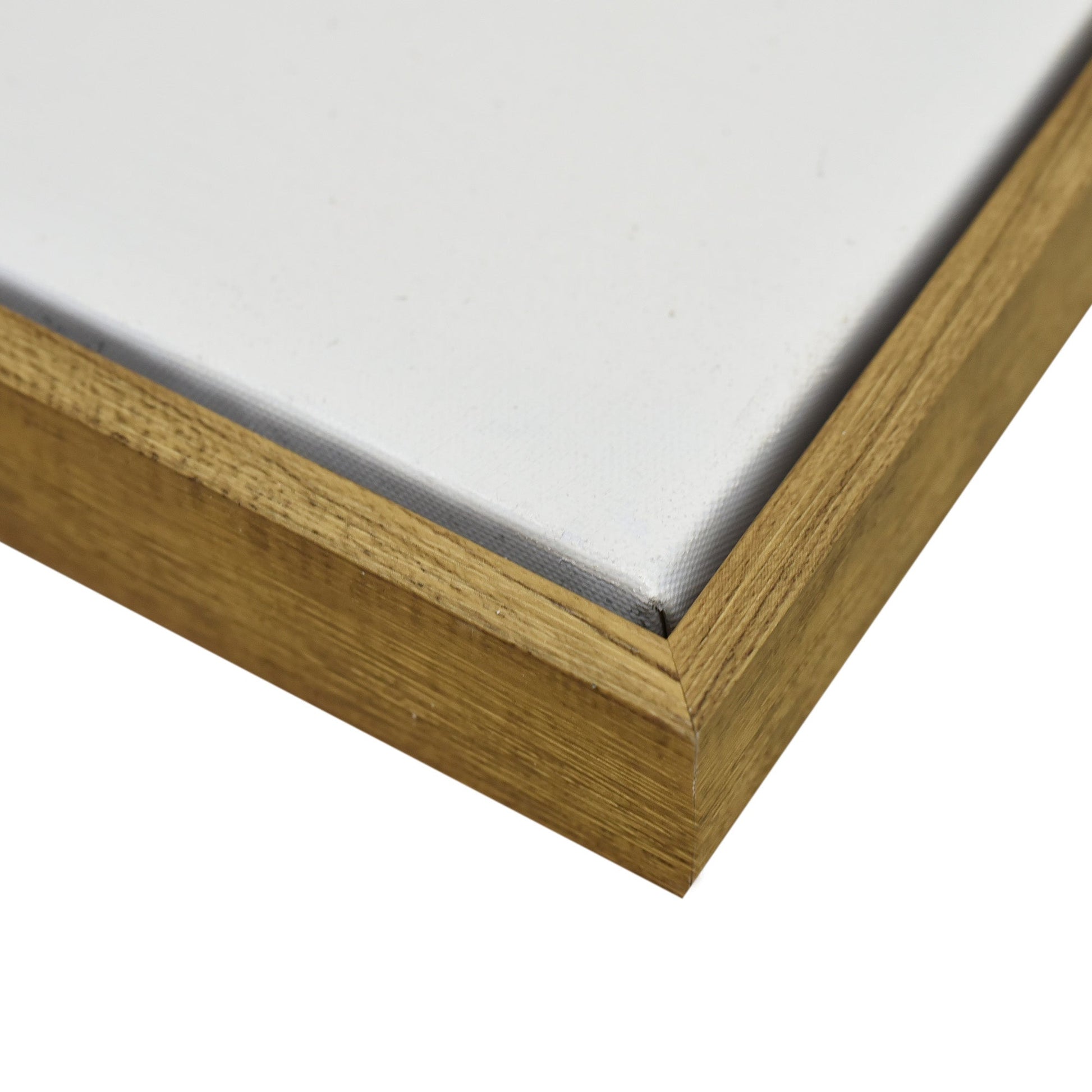 Stretched and gallery wrapped around a wooden stretcher and finished with a floating frame. There is a gap between the frame and print, which creates the floating effect and literally makes the canvas print stand out even more.