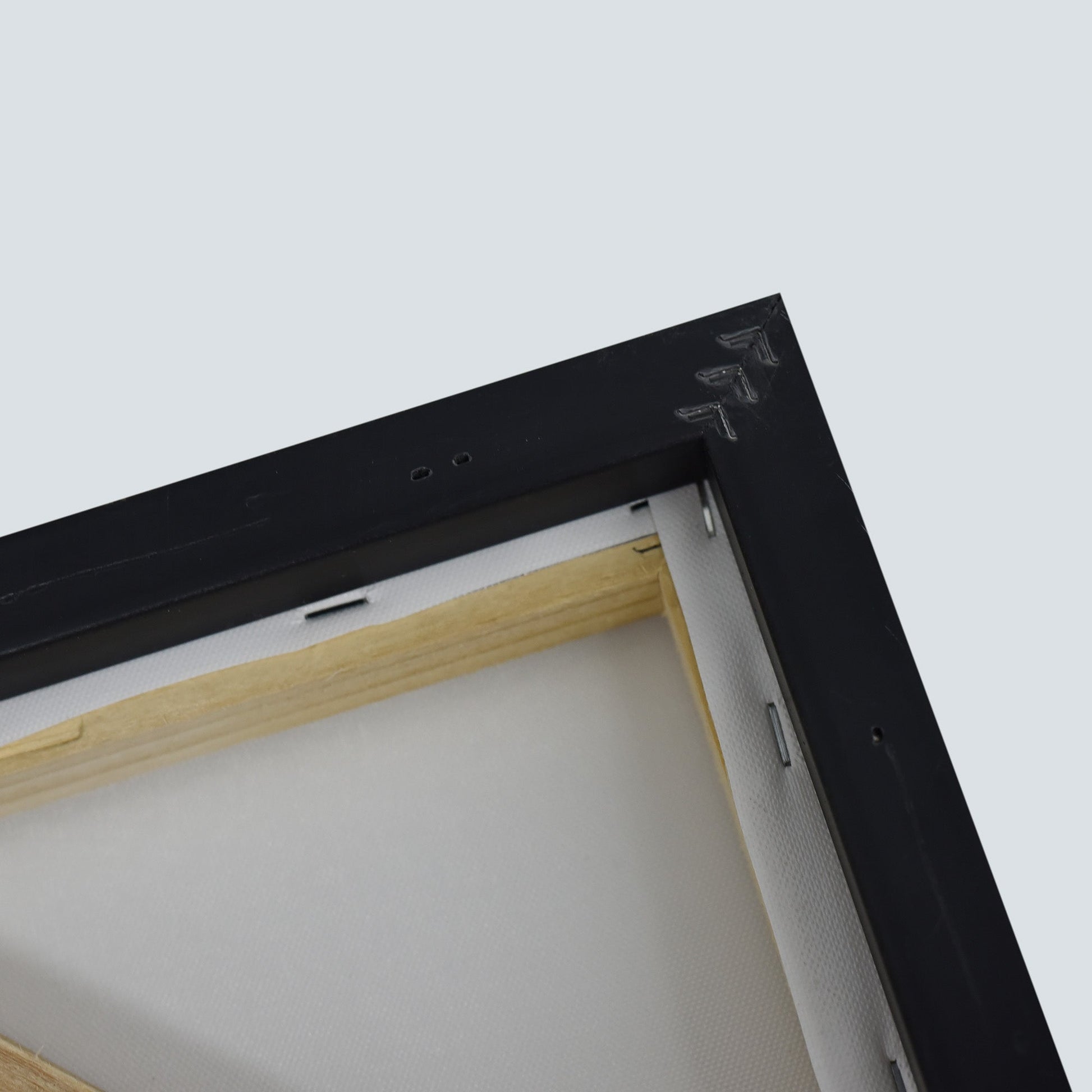 Stretched and gallery wrapped around a wooden stretcher and finished with a floating frame. There is a gap between the frame and print, which creates the floating effect and literally makes the canvas print stand out even more.