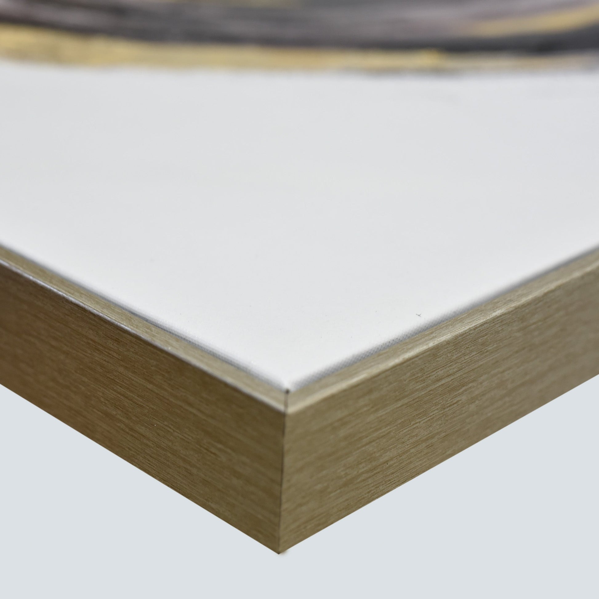 "Orbiting Elegance" is a harmonious blend of minimalism and intricate design. Set against a pristine white backdrop, the artwork draws attention to its centerpiece: a meticulously crafted circle, composed of overlapping strokes in black, grey, white, and gold. Each stroke is a testament to the artist's precision, effortlessly transitioning from one hue to the next, creating a rhythmic dance of colors. The gold accents, in particular, add a touch of opulence, making the circle gleam and shimmer as light interacts with it. Encased in a champagne-hued frame, the artwork exudes sophistication, making it a perfect addition to contemporary spaces. Crafted with a harmonious blend of hand-painted and printed techniques, "Orbiting Elegance" beckons viewers to appreciate the beauty in simplicity and the elegance in details.
