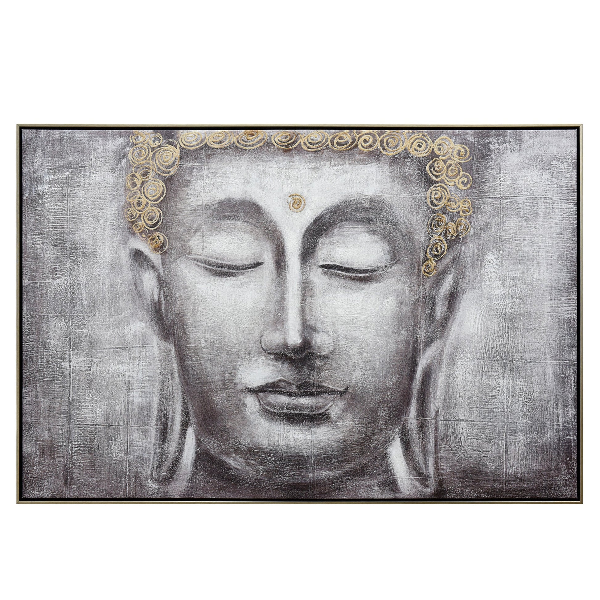 "Ethereal Enlightenment" is a captivating exploration of spiritual depth and tranquility. Dominating the canvas is the visage of Buddha, rendered in mesmerizing shades of grey and charcoal. The closed eyes evoke a sense of profound introspection and serenity, guiding viewers into a state of meditative reflection. What adds an ethereal touch to this otherwise muted palette are the delicate gold highlights, gracing the head and the bindhi (urna), symbolizing the third eye's awakened state. Every brushstroke, every gradient, is meticulously crafted, marrying hand-painted artistry with printed precision. Encased in a champagne-hued frame, the artwork exudes a sense of opulence and reverence. "Ethereal Enlightenment" stands not merely as a visual treat but as a gateway to inner peace and spiritual contemplation.