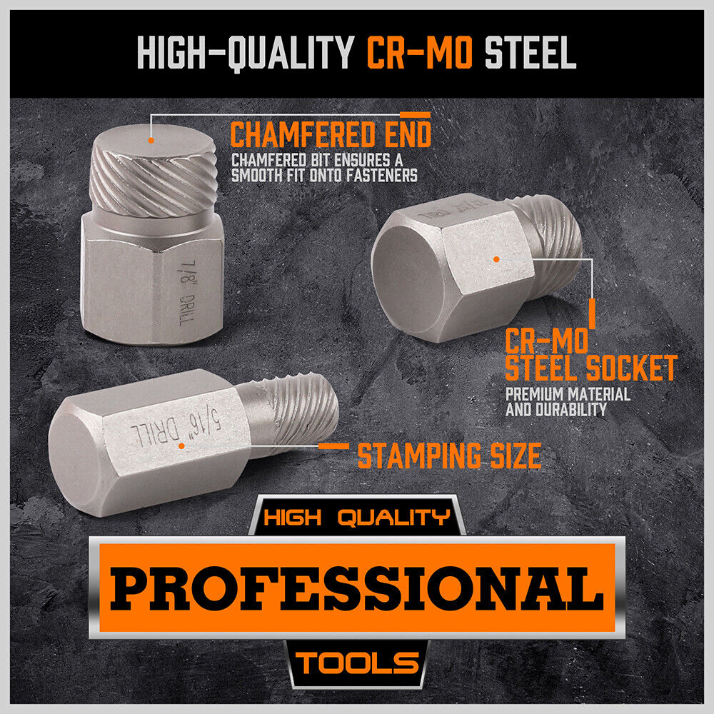 - [PRO-QUALITY]: Premium chrome molybdenum steel industrial grade extractors are ideal for removing broken screws, bolts, nuts, studs, fittings, threaded pipes and pins and is perfect for any mechanic’s tool kit.
