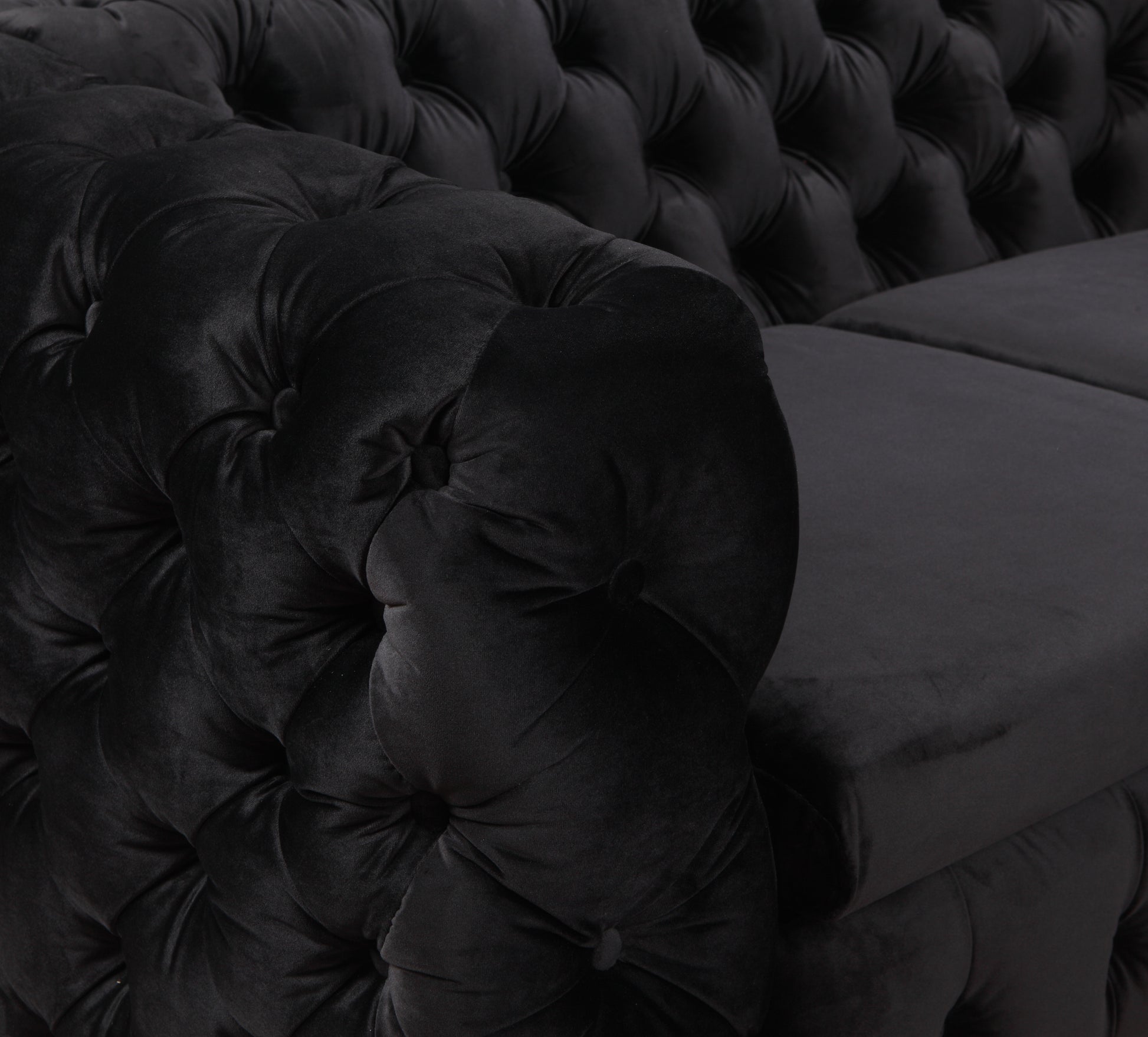 3 Seater Sofa Classic Button Tufted Lounge in Black Velvet Fabric with Metal Legs