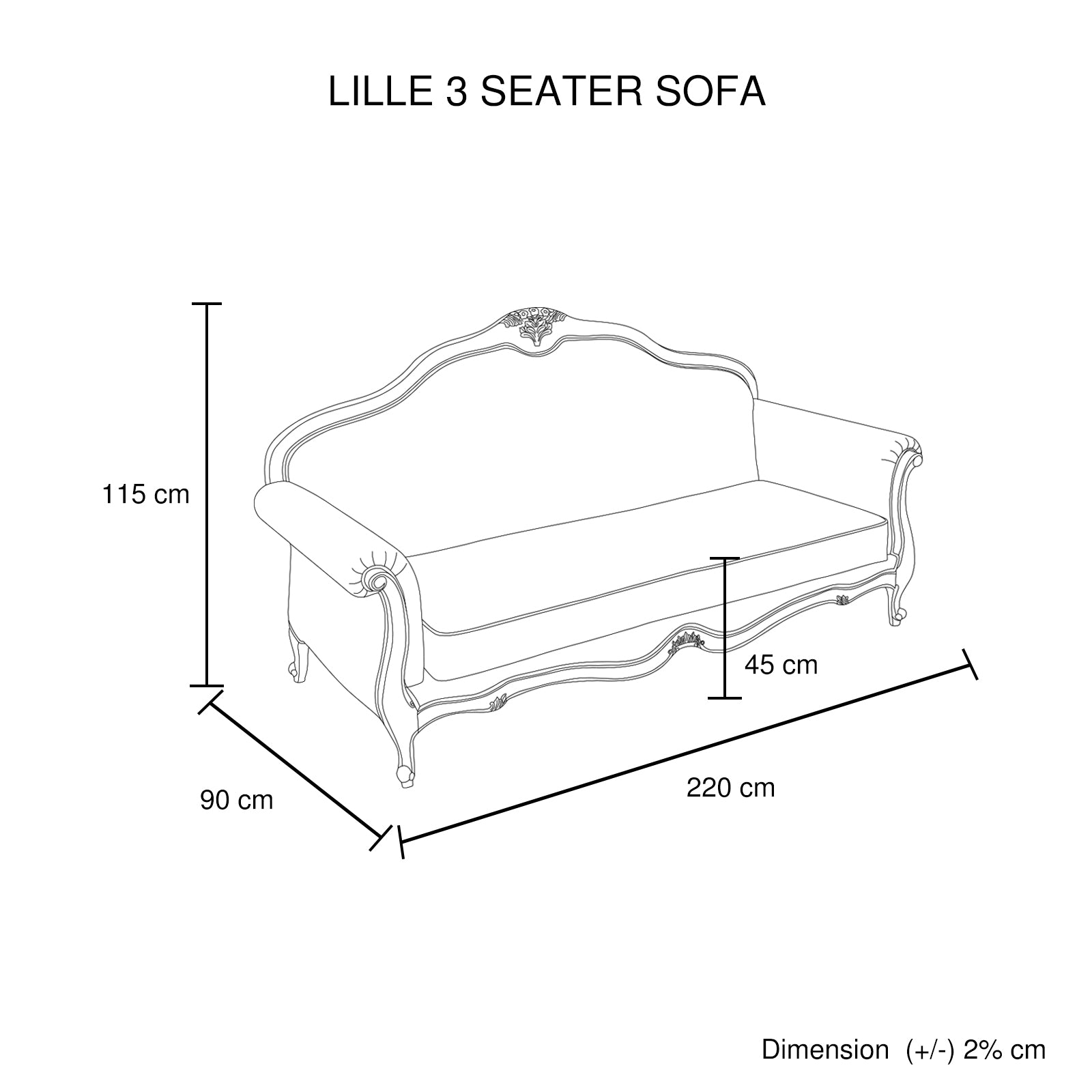 Our Lille sofa proudly boasts royal Chester Ford design and premium upholstered cover. Its medium high backrest has Oak wood frame and there is floral embellishment on top of the backrest