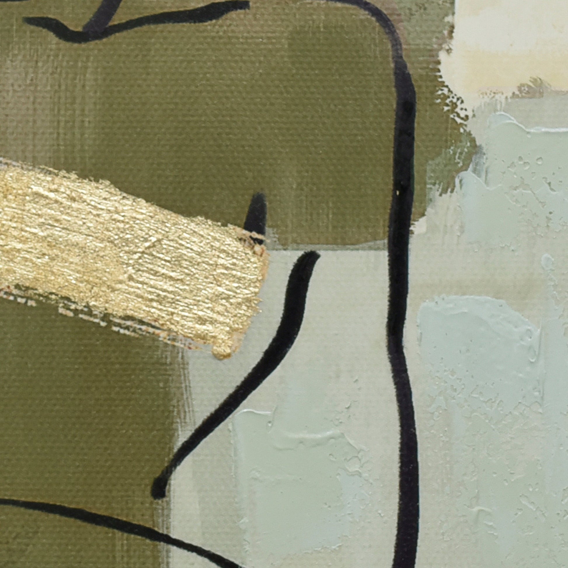 "Golden Veil" is an evocative piece that marries abstraction with figuration, capturing the raw essence of femininity. The background is a harmonious blend of vertical shades, ranging from the warmth of yellow and beige to the cool tones of cyan and green. This serene backdrop sets the stage for the striking silhouette of a woman, outlined in bold black. Poised gracefully, her figure exudes confidence and allure. Yet, what truly captivates is the thick dash of gold paint, both concealing and highlighting her form, acting as a veil of honor and strength. Encased in a dark wood frame, the artwork is a testament to the beauty of contrasts — between colors, between the seen and the unseen, and between vulnerability and power. Crafted with a blend of hand-painted and printed techniques, "Golden Veil" beckons viewers to delve deeper and appreciate the complexities of the female form.