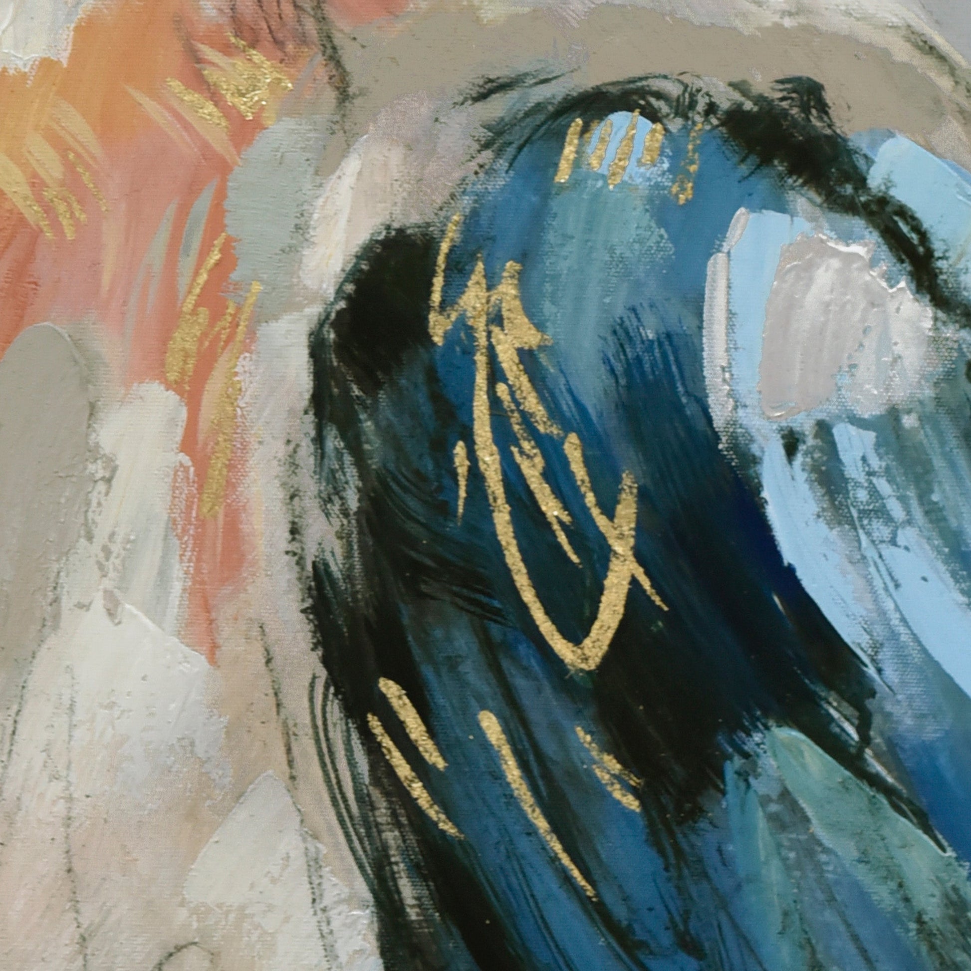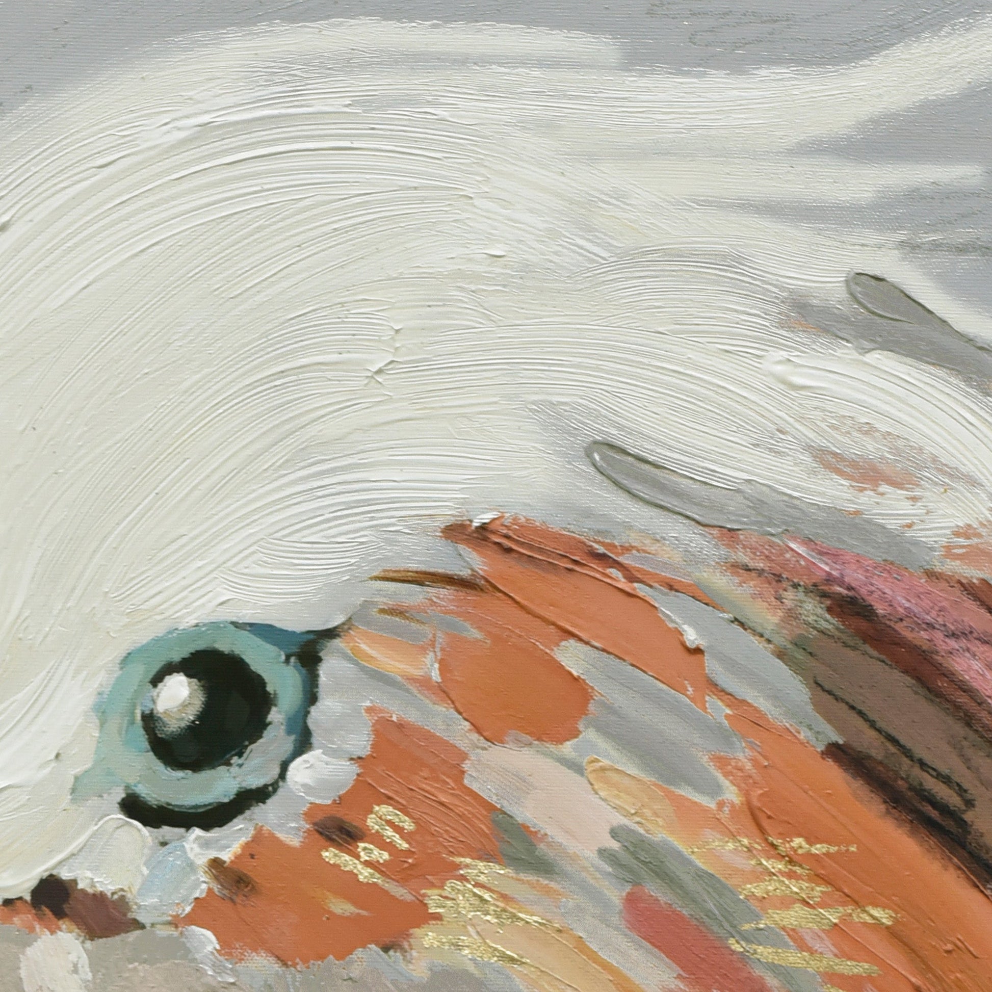 Discover the majesty of nature's creatures with "Cerulean Gaze," a 60cm x 90cm hand-painted masterpiece that brilliantly captures the essence of a cockatoo. The side profile of this majestic bird stands out in sharp relief, its pristine white plumage contrasted with vibrant orange cheeks and distinctive fan feathers that frame the back of its head and elegantly drape its neck. But what truly captivates is the cockatoo's eye and beak, painted in mesmerizing hues of blues and black, lending an enigmatic aura to the portrait. Set against a subtle light grey backdrop, every detail of the cockatoo is accentuated, from the delicate strokes that depict its feathers to the bold colors that define its character. Encased in a sophisticated dark wood frame, "Cerulean Gaze" is a celebration of the avian world, artistry, and the beauty of the unexpected.