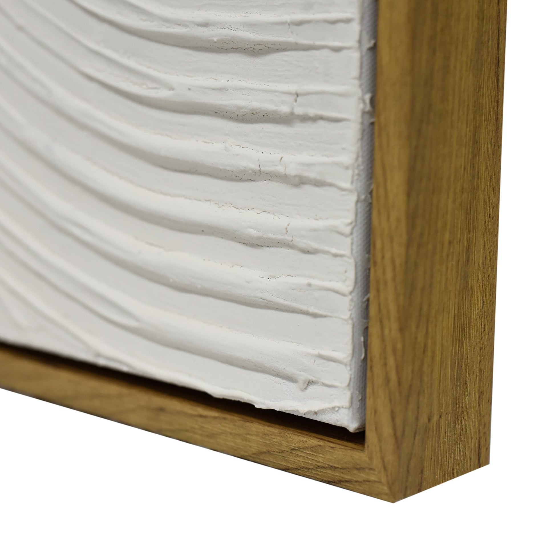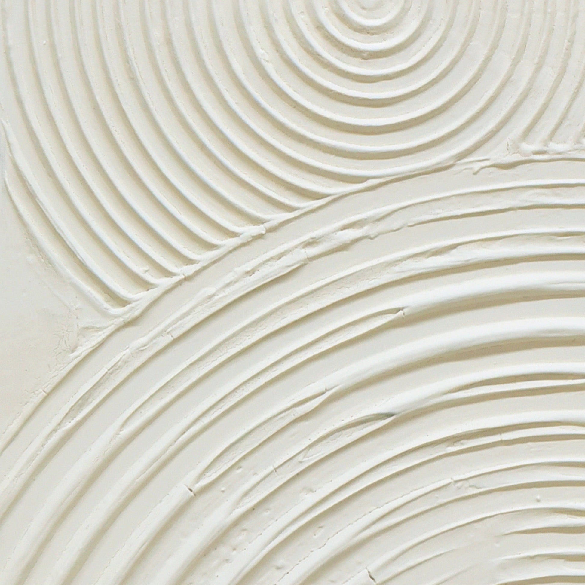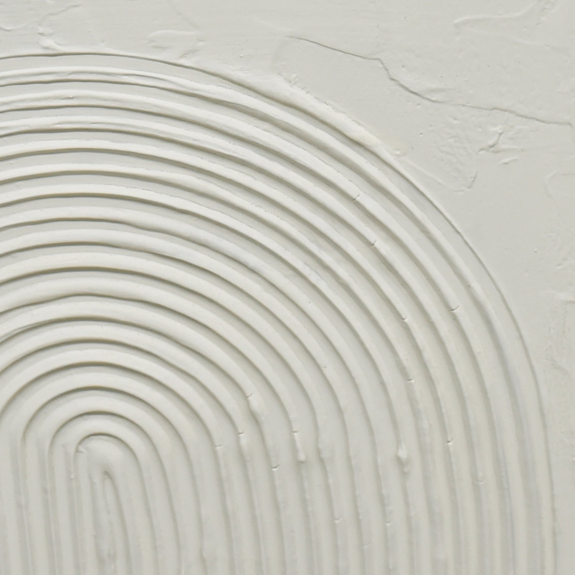 Nestled within a sophisticated dark wood frame, "Ephemeral Echoes of Continuity" presents itself as a 60cm x 90cm hand-painted tableau of texture and form. With its palpable white palette, the thick texture becomes a canvas for shadow and light to play, bringing the artwork to life. Carved delicately into this white expanse are a series of grooves: two U-shaped markings—one arching skyward and the other grounding downward—both suggesting cyclical movement and balance. Further complementing this dance of shapes are two concentric grooves, a demure half-circle and a subtle quarter-circle, reminding viewers of the moon's phases or the eternal cycles of nature. "Ephemeral Echoes of Continuity" is not just a visual experience but a tactile journey, beckoning one to reflect on the rhythms of life and the delicate balance of existence.