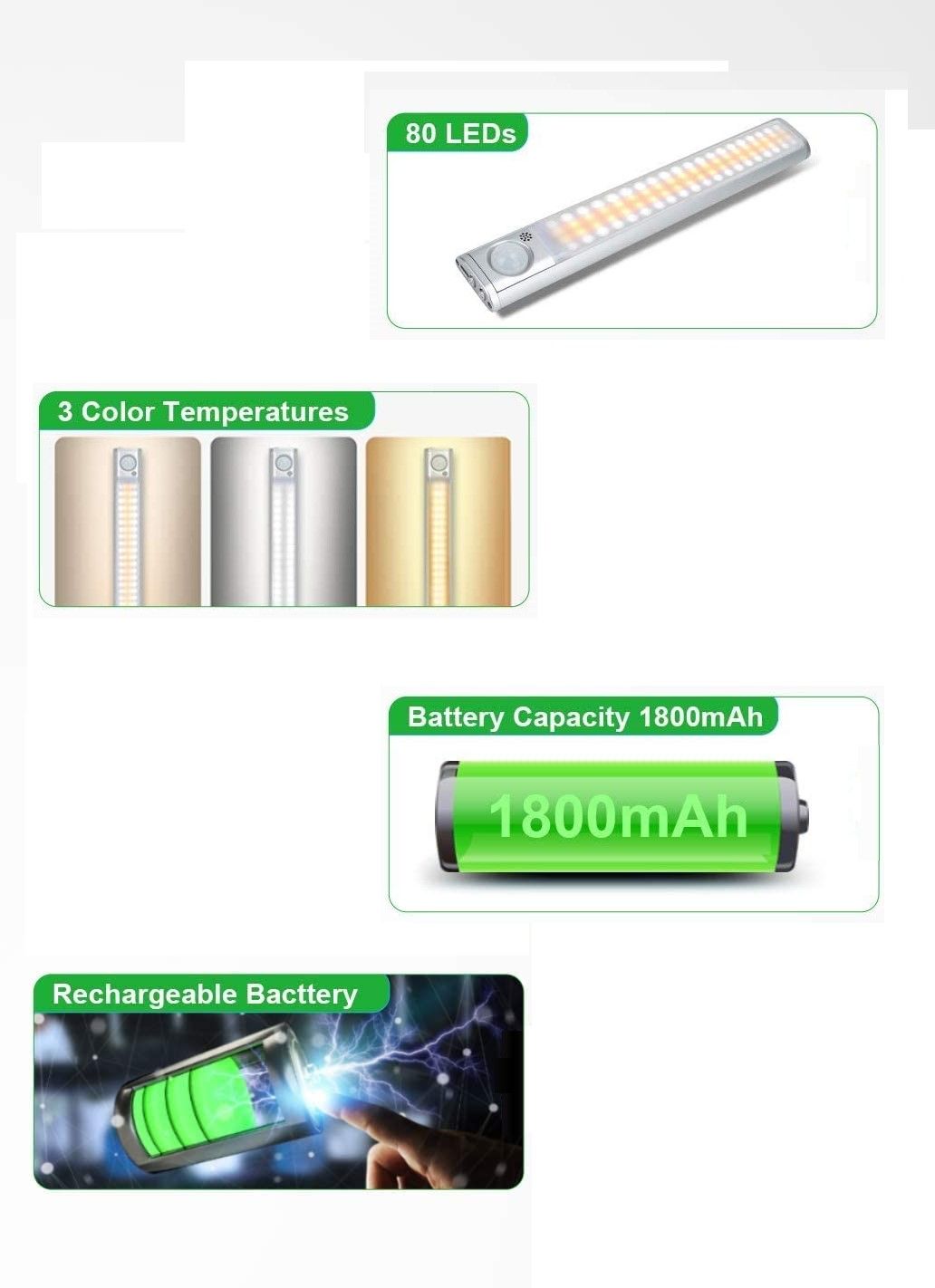 - Easy to install: Paste the magnetic strip to the place you want to fix, magnetically absorb the motion sensor closet light, and you are done. Couldn't be easier to install and remove. Equipped with 1800mAh rechargeable battery, stick on lights can be charged and reused many times, which is more efficient and environmentally friendly.