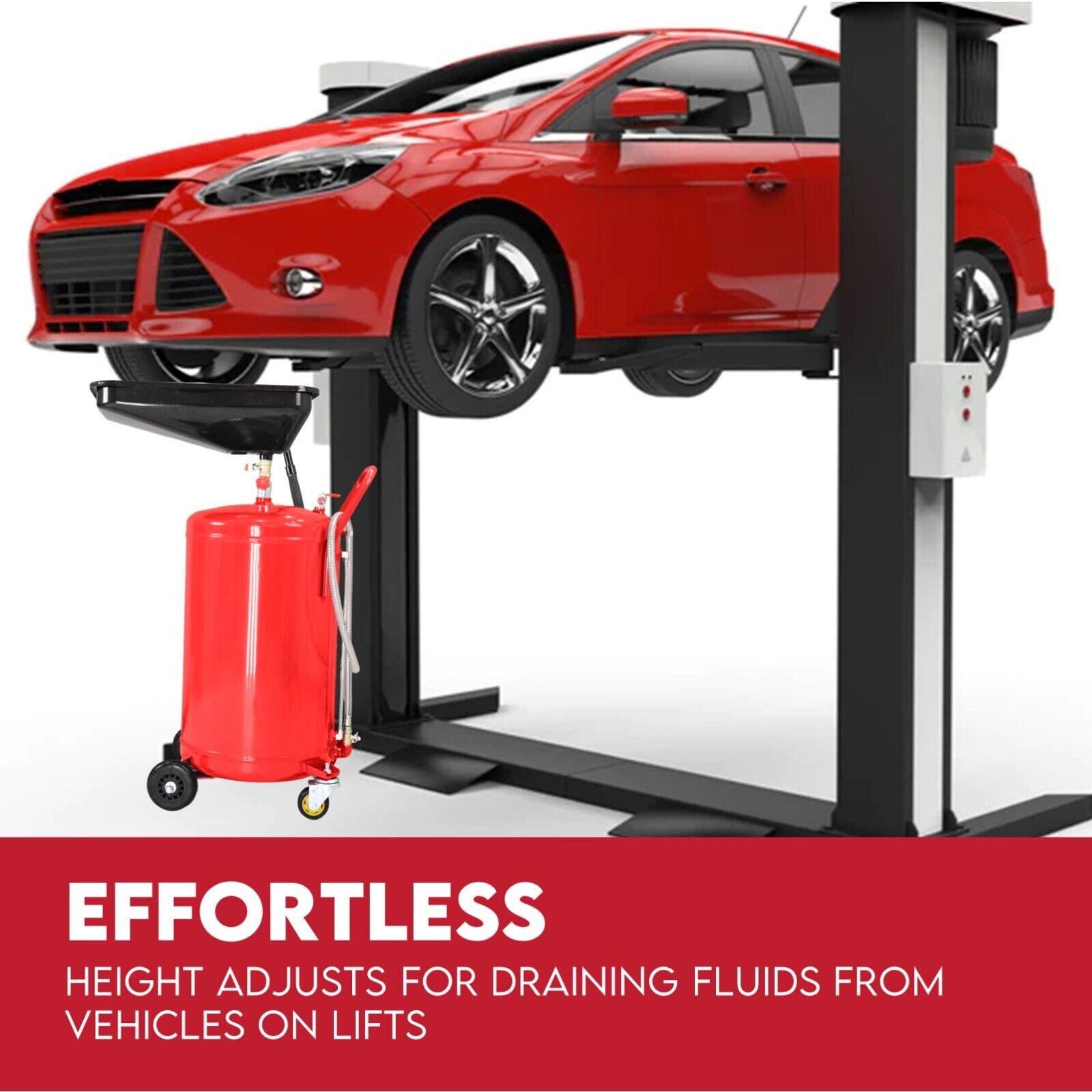 Use your air compressor and this oil drain to easily transfer the used oil from the built-in tank to your own secondary container for effortless recycling at any height. Height adjusts for draining fluids from vehicles on lifts.