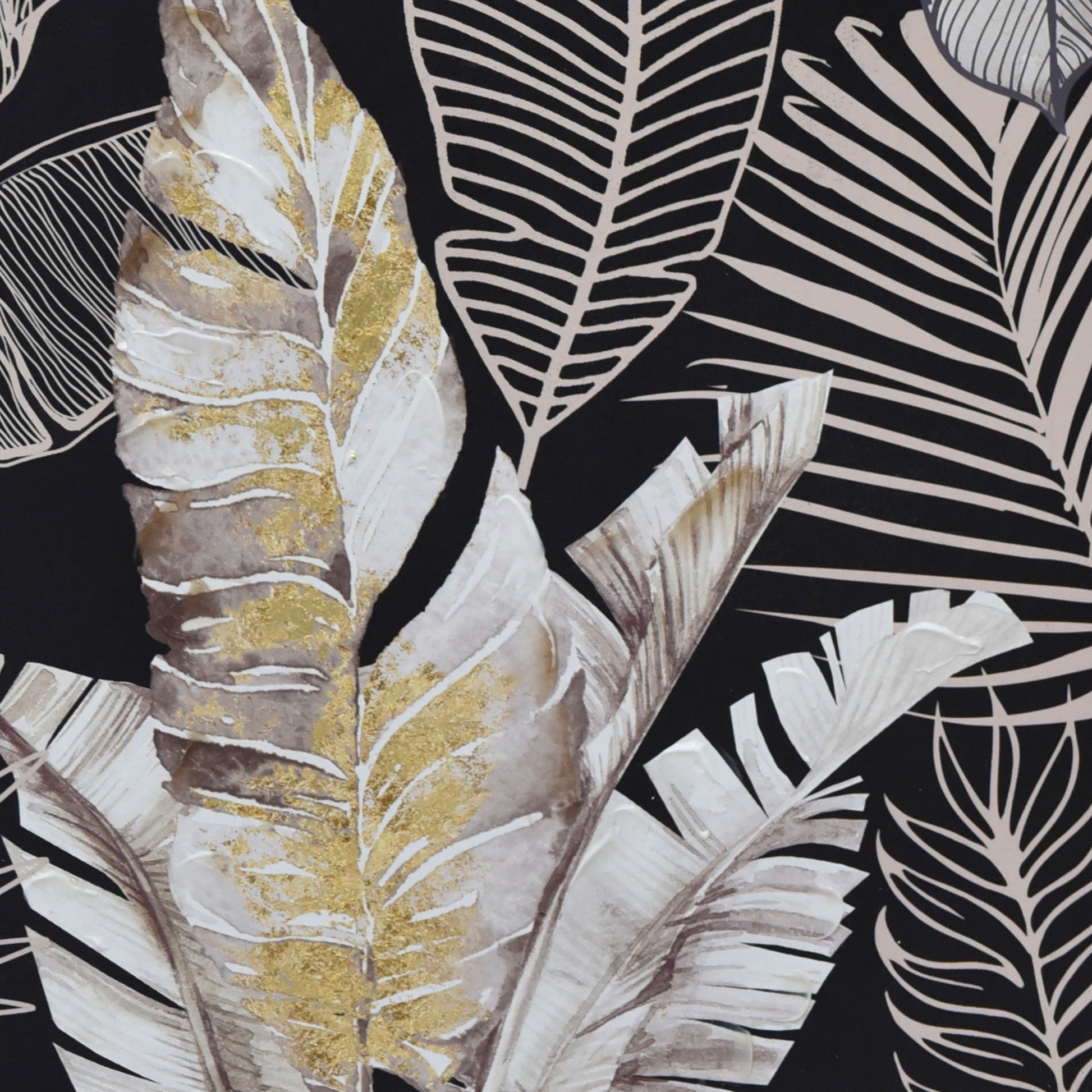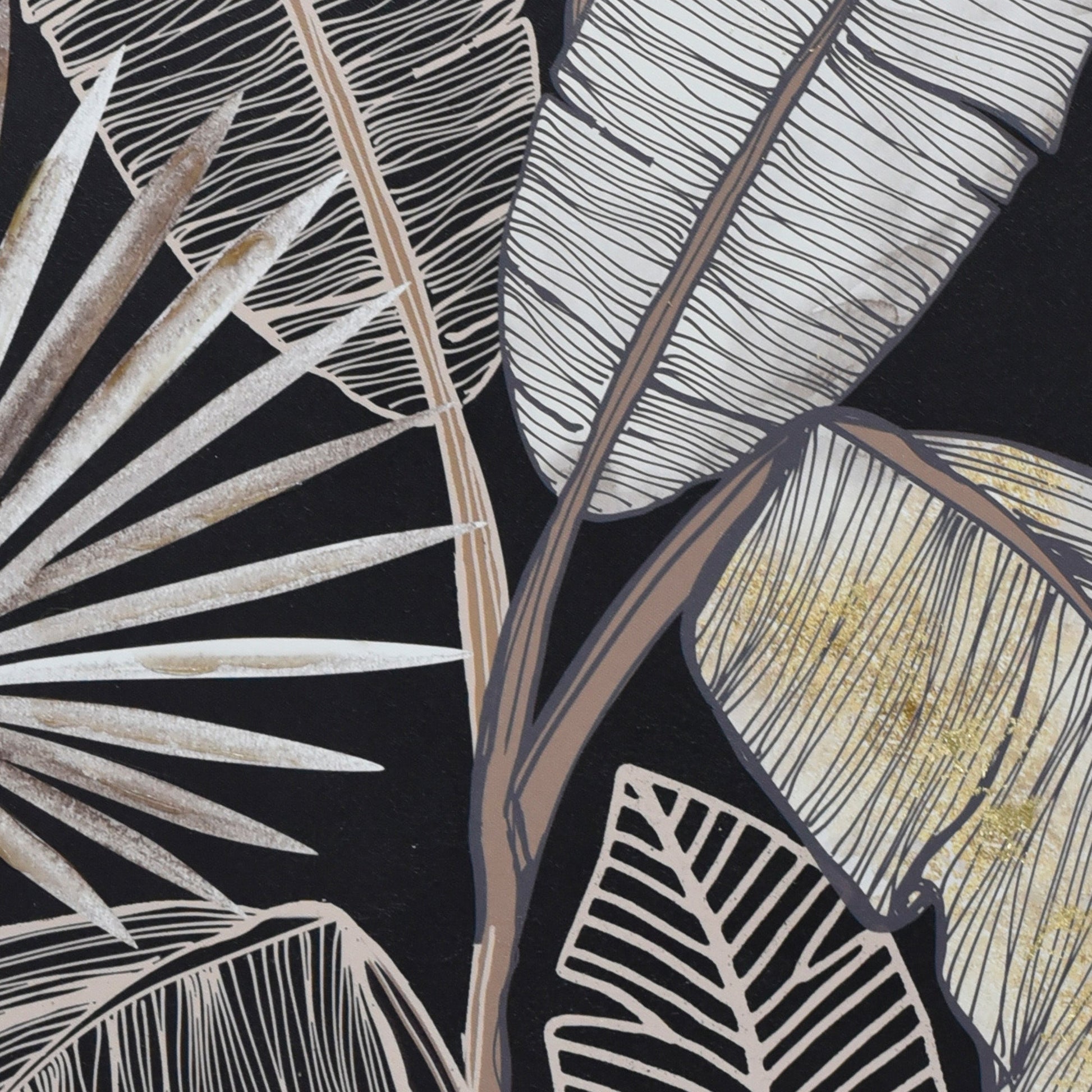 Dive into the mesmerizing contrasts of "Gilded Silhouettes", where soft beige and cream floral leaves elegantly emerge from the profound depths of a black canvas. The leaves, representing various species, are rendered with meticulous care, capturing the essence of nature's beauty. This artwork is a harmonious blend of 50% hand-painted elements and print, ensuring each detail is accentuated. The touch of gold highlights adds a layer of opulence, making the leaves gleam and shimmer when light kisses them. Encased in a champagne-hued frame, the artwork exudes a sense of luxury and sophistication. "Gilded Silhouettes" is more than just a visual treat; it's an ode to the delicate intricacies of nature, portrayed against the starkness of night, creating a captivating dance of light and shadow.