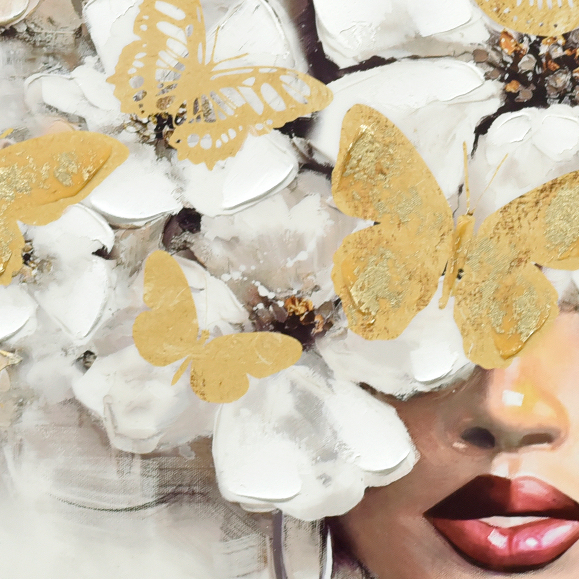 "Floral Fantasia" is a mesmerizing fusion of the human form and nature's bounty. At its core lies the portrait of a woman, her features beautifully accentuated with striking lipstick and a chic black top adorned with white spots. But what truly captivates the viewer's gaze is the cascade of white flowers that replaces her tresses, flowing in a dreamy abundance and covering the top half of the canvas, hiding her eyes. These blossoms are brought to life with the ethereal presence of gold butterflies, adding a touch of whimsy and wonder. Crafted with a harmonious blend of hand-painted details and print, the artwork is framed within dark fir wood, grounding its ethereal elements. "Floral Fantasia" isn't merely a portrait; it's an enchanting tale of beauty, mystery, and nature's magic.