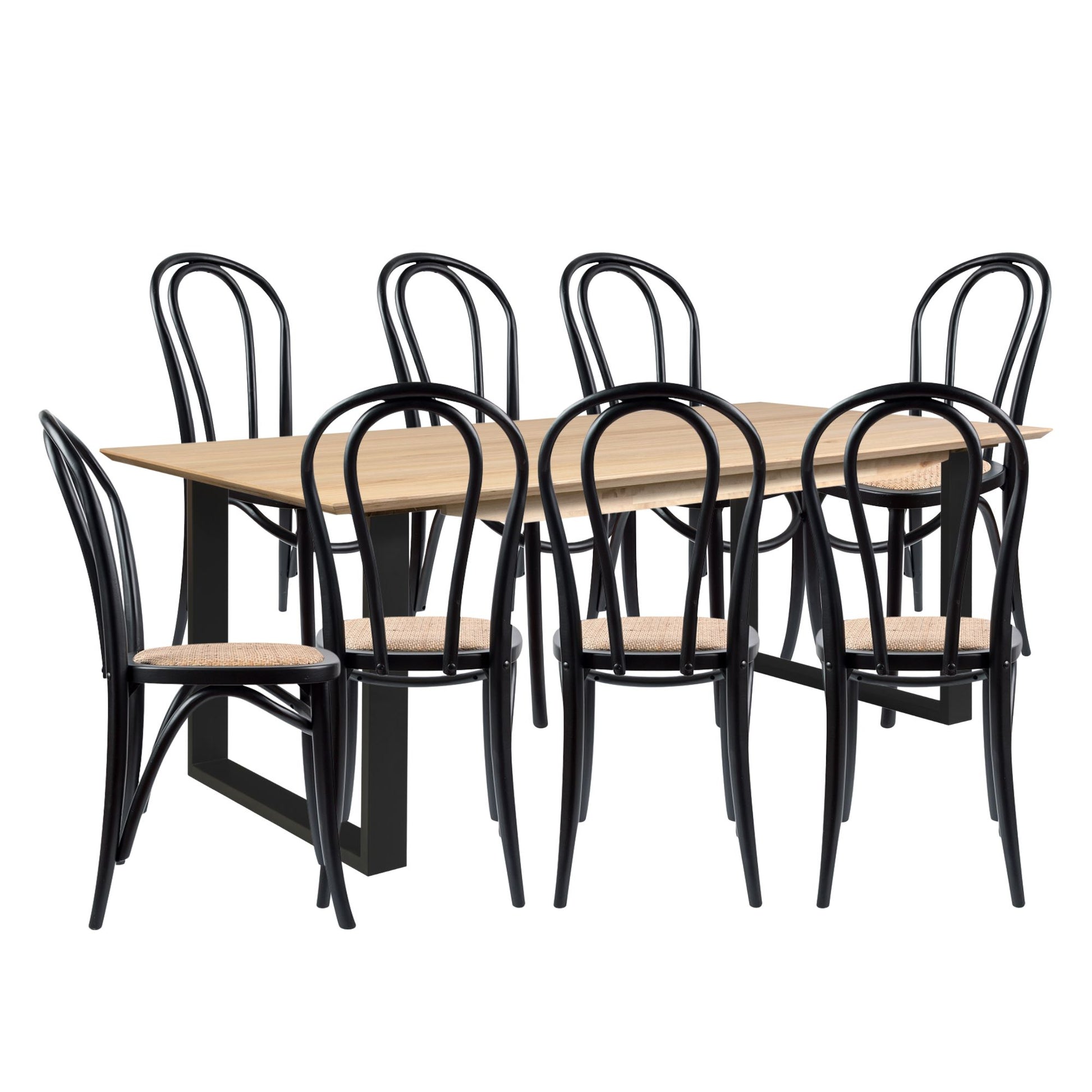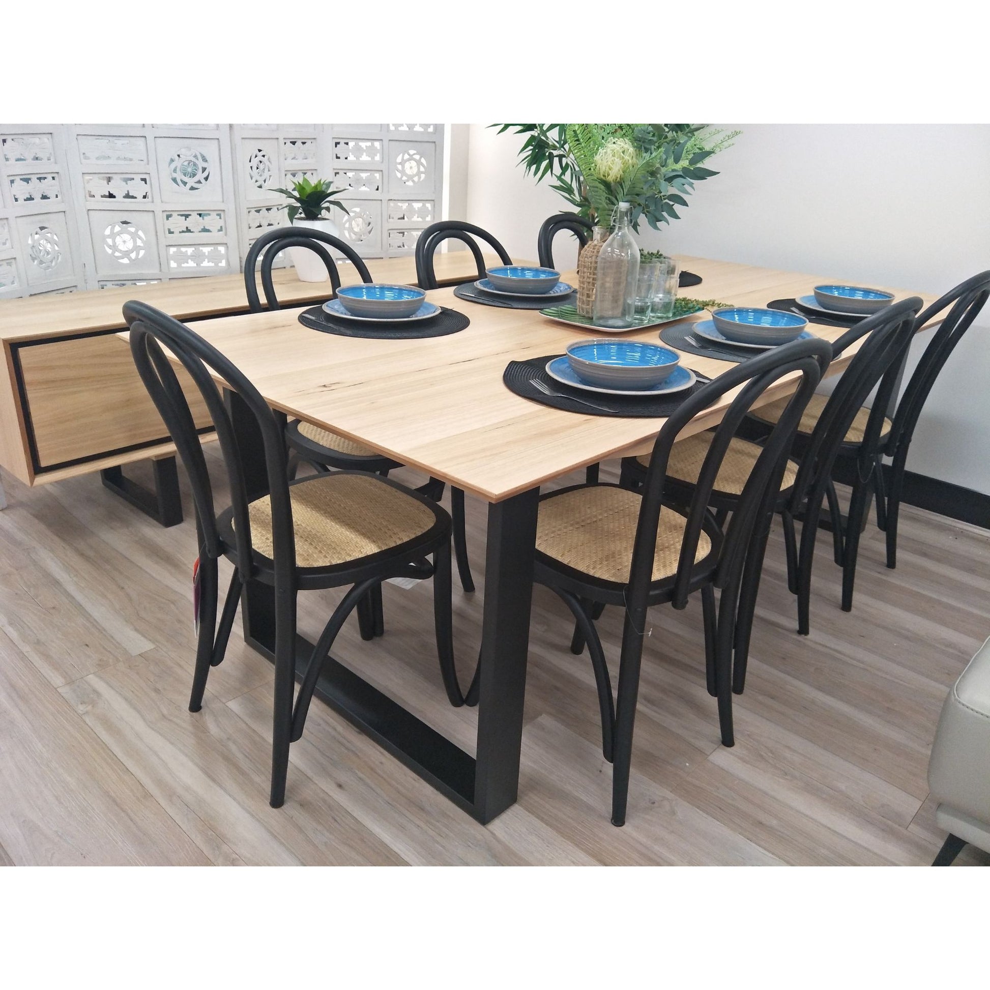 A nice dining set enhances the joy of spending good times with family. Bring home this good looking 9-piece dining set and feel that. The set is composed of a gorgeous 8-seater dining table designed in the modern style. The table looks exceptionally lovely as it is made of sustainably harvested solid messmate timber with veneer. The wood makes the table super strong, durable and heat resistant. Painted in a natural PU finish, the tabletop is paired with black powder coated metal leg frame. The elegant dining table has a one-of-a-kind design with a tabletop and legs in different colours and styles. The exceptionally beautiful table is complemented equally beautiful dining chairs that are designed in the traditional style. These are beautiful chairs in black designed in traditional style with comfortable back and hip support. A Rattan cushion seat in lovely light grey colour enhances their beauty. They set looks stunning in all decor settings, thanks to its homely design and multi-colour finish. A one-year warranty is included with this easy to assemble dining set.