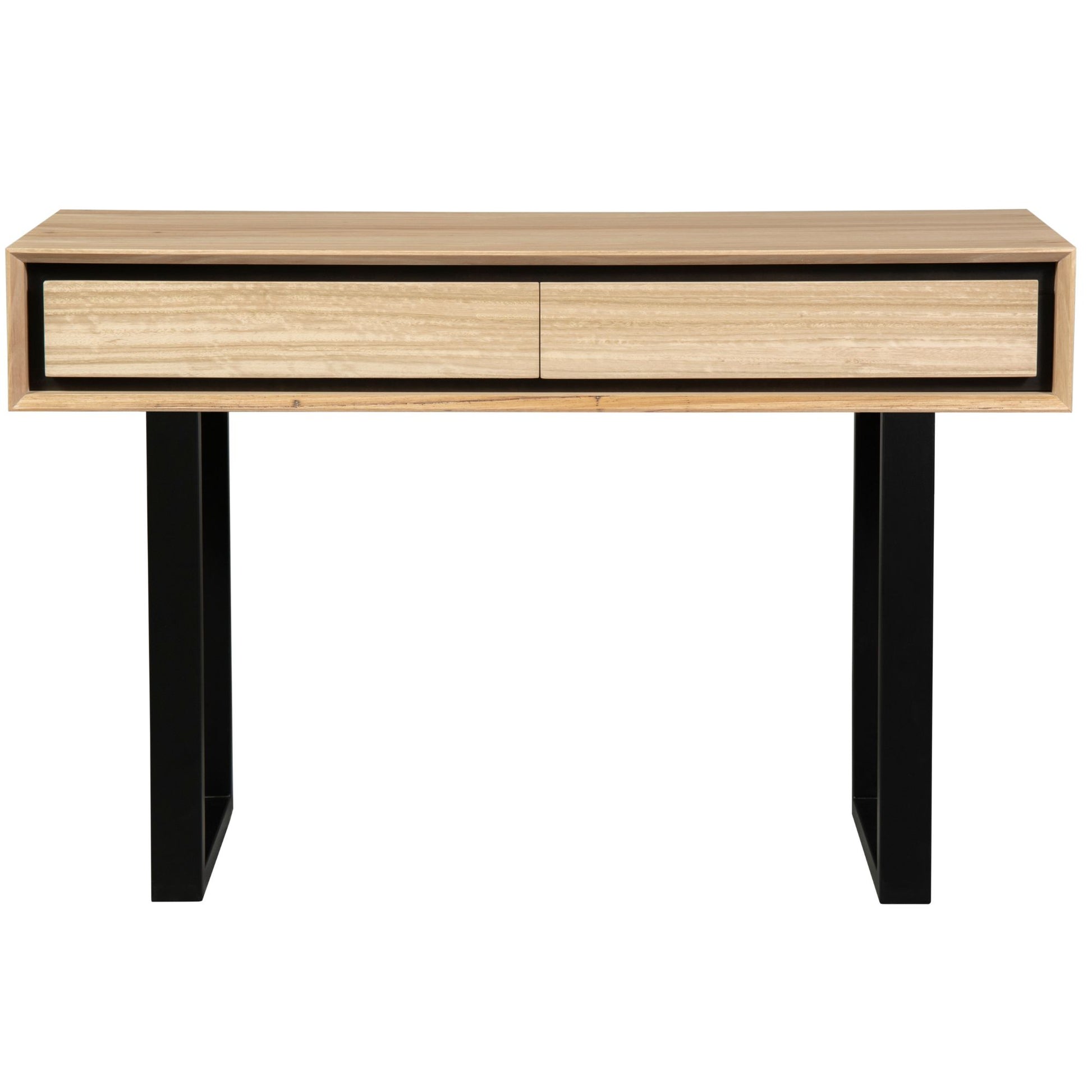 Add the value of convenience to your living room with this sleek console table with storage space. The table has 2 drawers with full extension metal runners. The unique furniture piece is made of sustainably harvested, MDF, Solid and Veneer Messmate, Solid Rubber, and Kiri Wood. The combination makes it super strong, and durable. All drawer fronts are made from solid messmate. The drawer boxes are made from Kiri wood with a finger joint construction and a messmate veneer base. Both drawers have integrated handles for a clean seamless look. Black shadow gap around the drawers add to the table's beauty. Painted in a natural PU finish, the console table is paired with black powder coated metal leg frame. The elegant table has a one-of-a-kind design with top and legs in different colours and styles. A one-year warranty is included with easy-to-assemble console table.