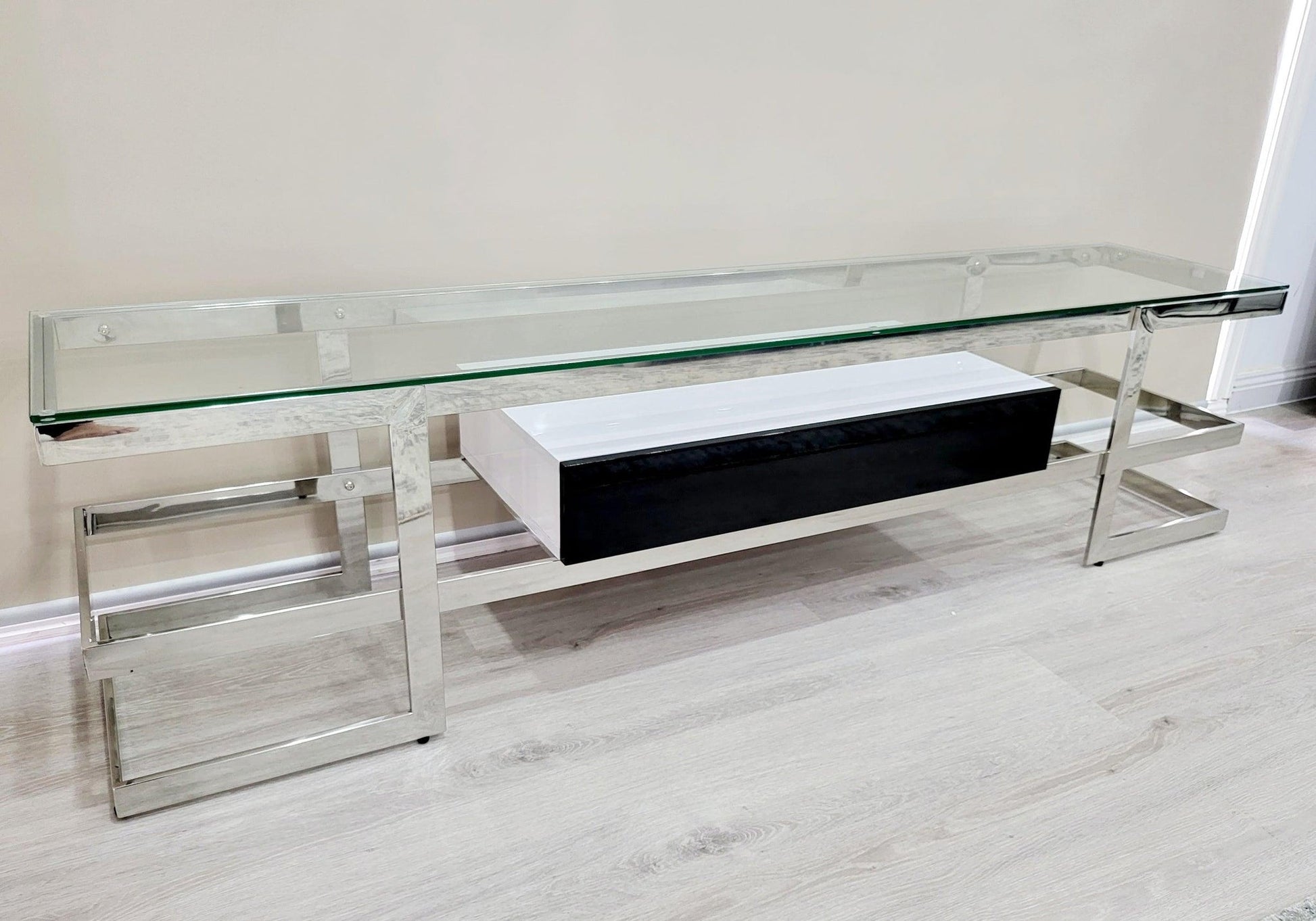 Introducing the Alexa Silver TV Unit. This modern and stylish piece of furniture is sure to make your living room look brand new! With a sleek silver finish and unique design, this 180cm x 40cm x 45cm TV UNIT is sure to make a statement in any home. It is strong and durable, yet lightweight and easy to assemble, perfect for even the tightest of spaces. The sturdy tabletop provides plenty of room to house your TV or decorative items, while the bottom shelf is perfect for storing books, consoles and remotes, DVDs or Blu-Ray discs, magazines and more. Its contemporary style makes it ideal for mixing and matching with other modern furnishings. Inject some fun into your space with the Alexa Silver TV Unit Table today!