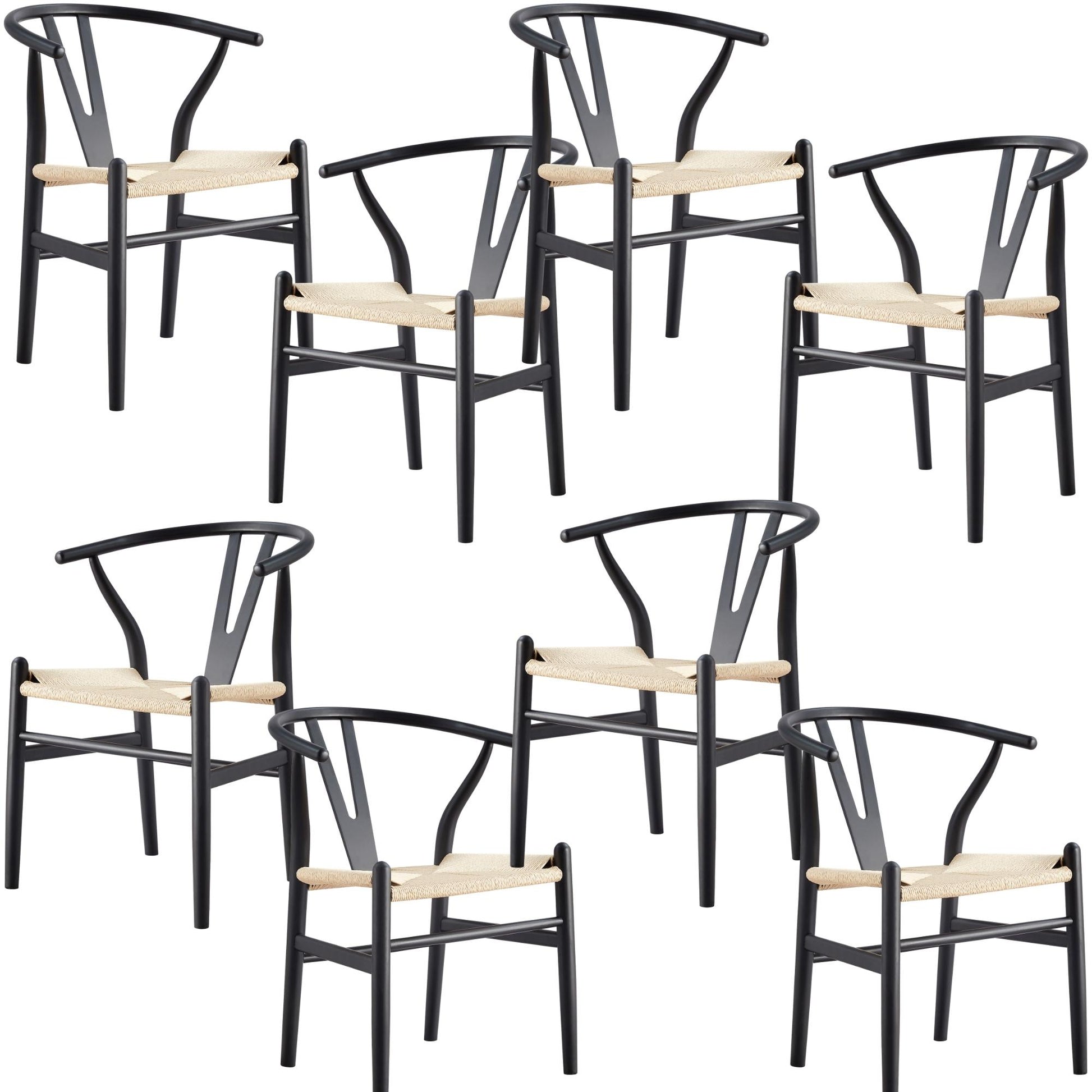 A classy dining chair enhances mealtime delight. Feel it by decorating your dining area with this attractive 8-piece set of dining chairs in black, designed in the Scandinavian style. The iconic Hans Wegner Replica Wishbone chairs, featuring timeless curved back and armrest, with a hand-woven paper twine seat in natural colour, ensure lasting comfort. Because of a wooden construct, and strong legs, they are a beautiful addition to your dining space. They look stunning in any decor settings, thanks to their homely design and sleek style. The beautiful chairs are made of high-quality Beech wood and Recycled Paper Twine, obtained in a sustainable manner. A one-year warranty is included with the fully assembled dining chair.
