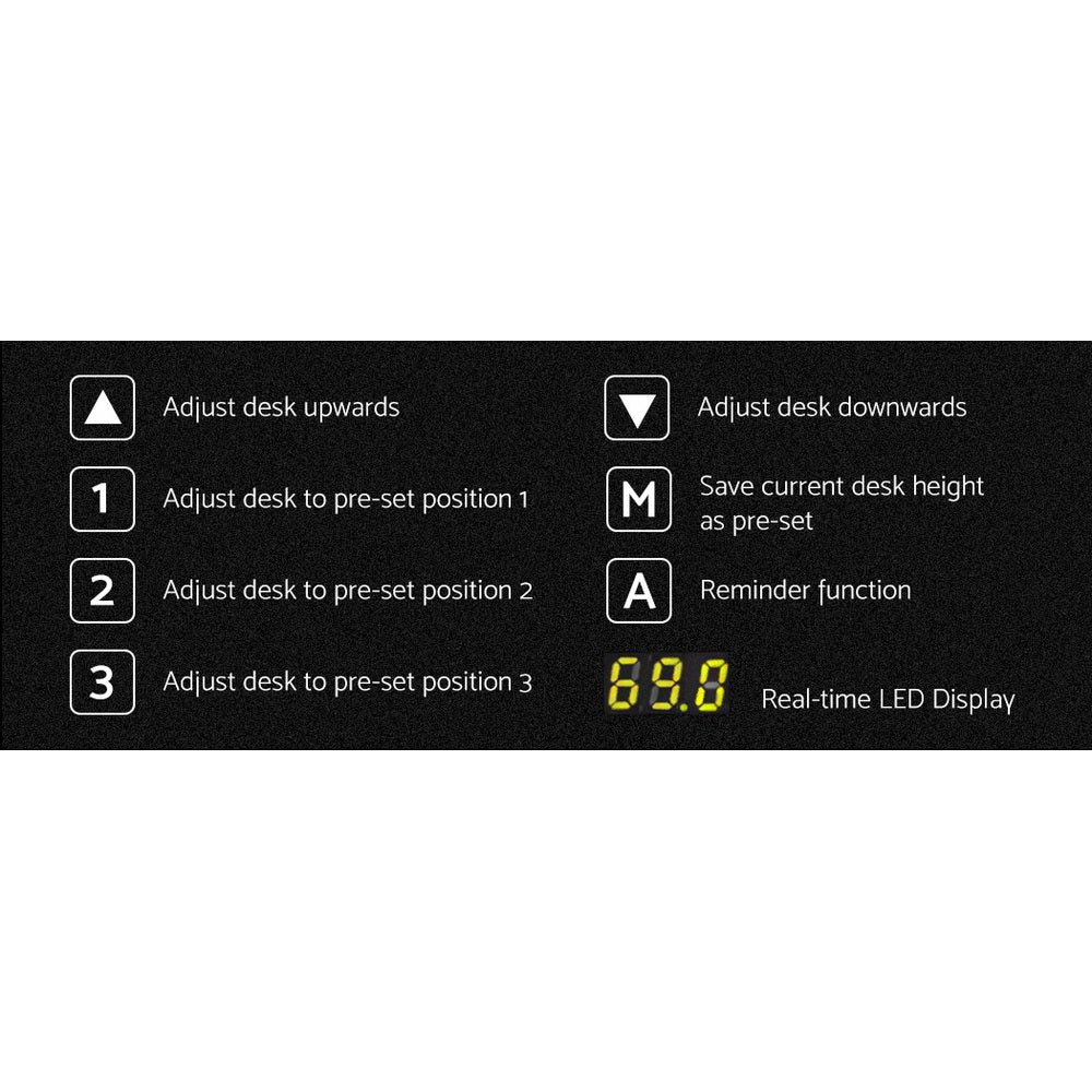 Poor posture and sedentary lifestyles contribute to several health issues. Now keep your health in good shape with Artiss motorised sit and stand desk frame! It’s designed to go with our Artiss desktop and won’t disappoint you either with its quality or aesthetics. With our innovative height-adjustable desk frame, you can stand while working and stretch and engage your muscles to prevent them from weakening. Our desk frame features an easy-to-use digital control panel. It enables you to save up to three preset heights and set a sit/stand reminder system. And the smooth-functioning dual motors allow ultra-quiet operation with low energy consumption. Furthermore, our high-quality powder-coated desk frame makes cleaning and maintenance easy and ensures ultimate sturdiness. It also comes with adjustable rubber foot pads that offer extra stability and keep your floors safe. Get yourself Artiss sit/stand desk frame to prevent fatigue and improve productivity.