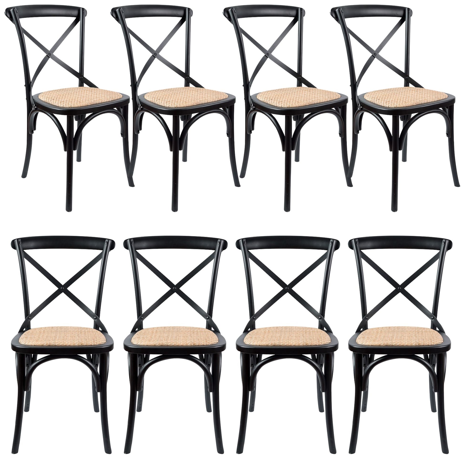 A stylish dining chair enhances mealtime enjoyment. Realize this happiness by decorating your dining area with this 8-piece set of attractive dining chairs in black, designed in the traditional style. Featuring a woven rattan padded seat, the chair's frame is crafted by using the traditional methods of steam bending wooden rods. Because of its wooden construct, curvy legs, and cross-backed design, it is a beautiful addition to your dining space. It looks stunning in all decor settings, thanks to its homely design and sleek look. The beautiful chairs are made of high-quality Birch timber and Rattan, obtained in a sustainable manner. A one-year warranty is included with the fully assembled dining chair.