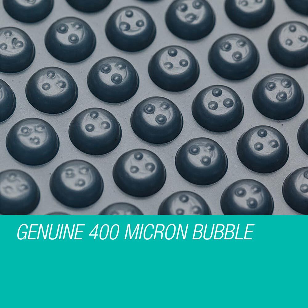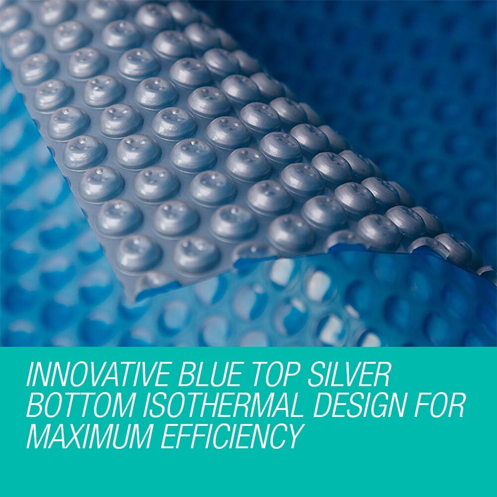 The innovative split blue and silver isothermal design fulfills unique benefits for your pool. While the sun is shining, the translucent blue rippled surface allows for greater heat to easily pass through, magnified by the bubbles to naturally heat the water. The silver underside then acts to trap the heat underneath and retain the pools warmth for longer periods of time, which means swimming seasons extend further into the year. This isothermal effect also inhibits the negative effects of photosynthesis such as the proliferation of algae.