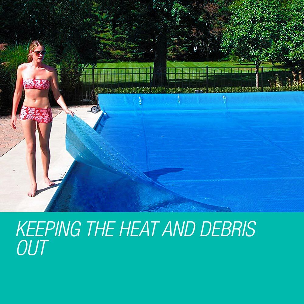 The Aurelaqua Solar Swimming Pool Cover with Roller also eliminates 98% of your pools water evaporation and keeps expensive chemicals needed to maintain pool health from escaping through the surface. Your pool will be exceptionally clean all year with the cover denying any debris access to the water. Moreover, the 400 Micron Bubble is the perfect weight and thickness for pool owners who wish to regularly take the cover on and off with ease, while durable enough to withstand tearing, sun and chemical damage.