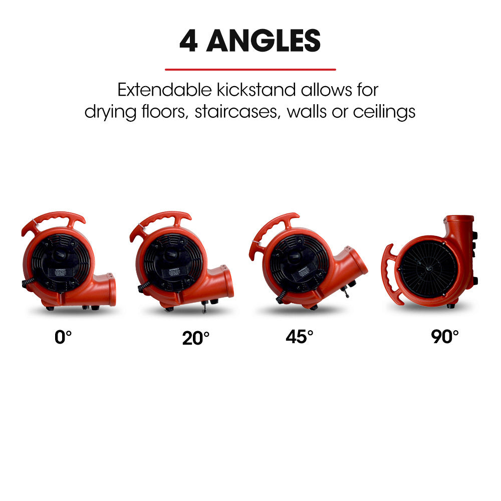This Air Mover also features an extendable kickstand which allows for adjusting the angle for the most effective drying of floors, staircases, walls and ceilings.