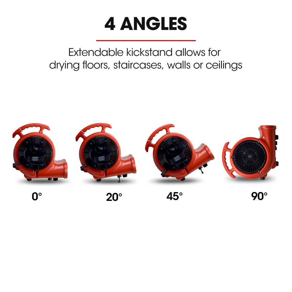 This Air Mover also features an extendable kickstand which allows for adjusting the angle for the most effective drying of floors, staircases, walls and ceilings.