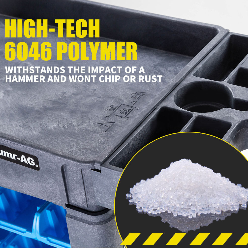Thanks to its rugged construction, the Baumr-AG Bin Cart is virtually maintenance free and easy to clean. Made of heavy duty 6046 polymer, it will not dent, rust or chip. Add to that, you save a lot of precious work space with its dual-sided design.