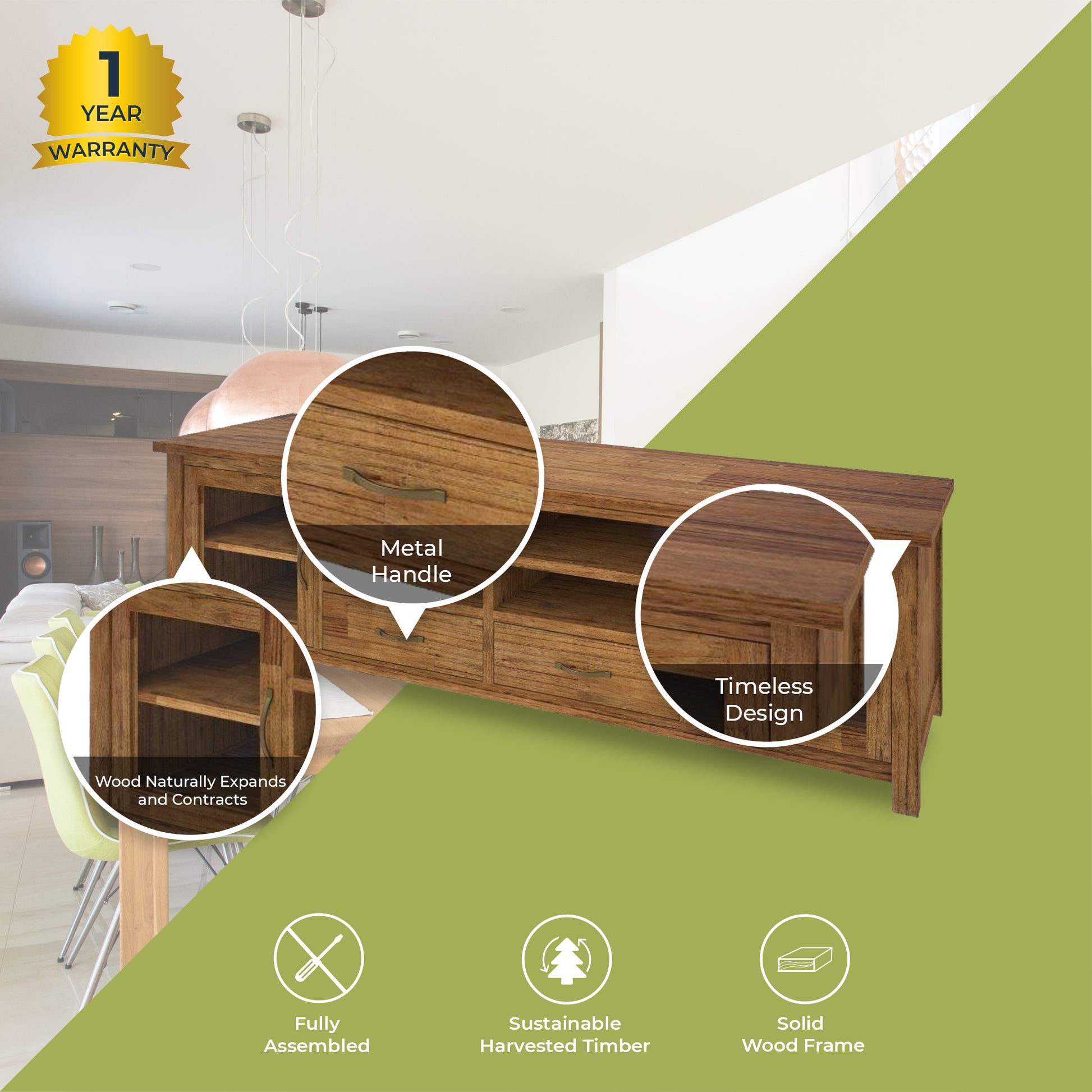 Bring positive vibes to your living area with this beautiful entertainment unit in natural colour. The unit has 2 doors covering 4 compartments, 2 sizable drawer and 4 niches with cable holes. All the doors and drawers have metal handles and drawers have full extension metal runners. The entertainment unit is designed in the traditional style, and it has strong, thick legs. The furniture piece is made of sustainably harvested solid Mountain Ash wood with naturally occurring grains and knots. The wood is known for its attractive looks, strength, shock-resistance, durability, and ease of maintenance. The wood is also break-resistant as it naturally expands and contracts with seasonal changes in humidity. The ETU looks stunning in all decor settings, thanks to its homely design and natural colour finish. The fully assembled ETU comes with a one-year warranty.