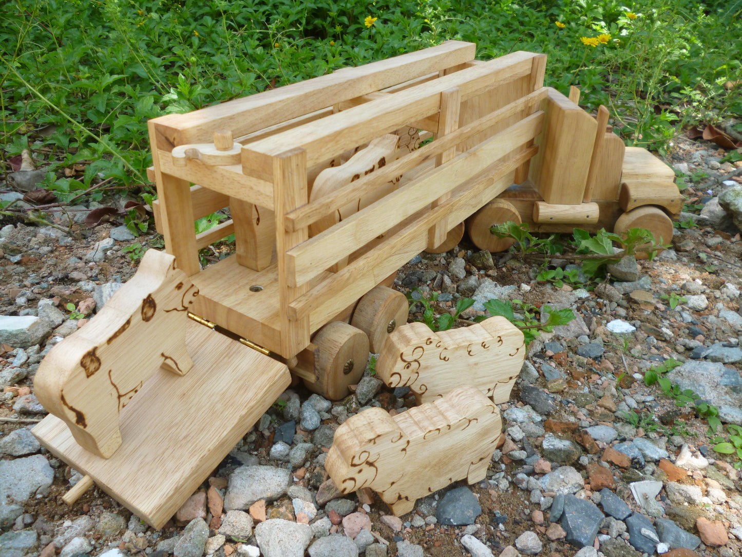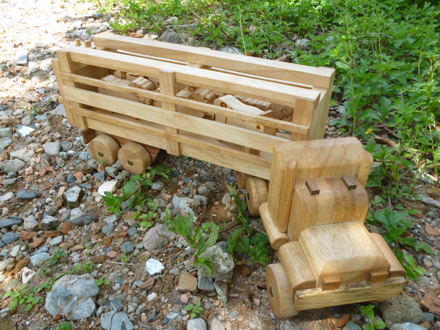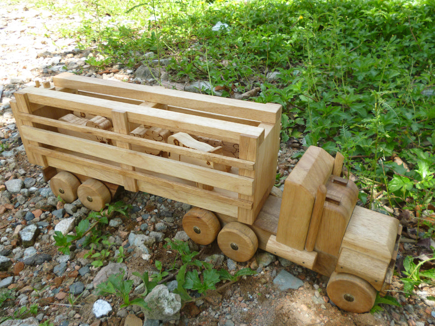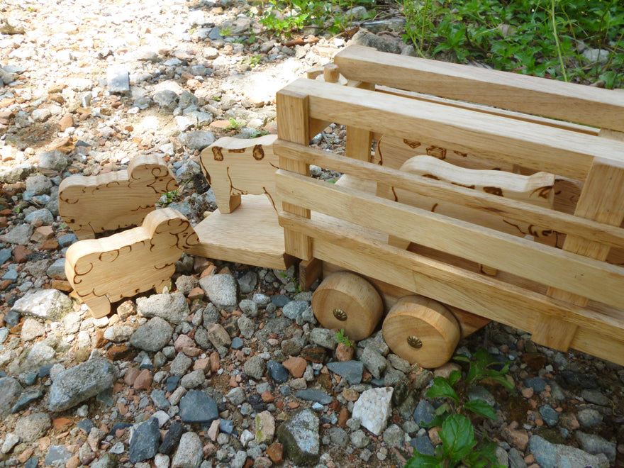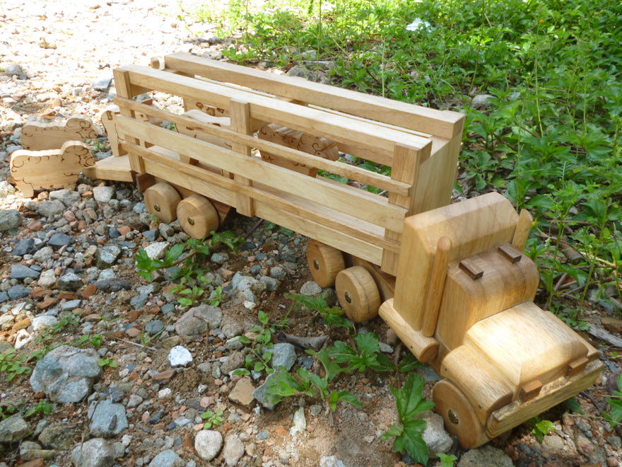 Beautiful hand made castle truck, comes with 6 animals ( 3 sheep, 3 cows). The truck is oiled. the trailer is detachable. This is a quality toy that lasts! All toys are made of plantation timber, using non-toxic, child safe materials. Size 60X15X15CM.