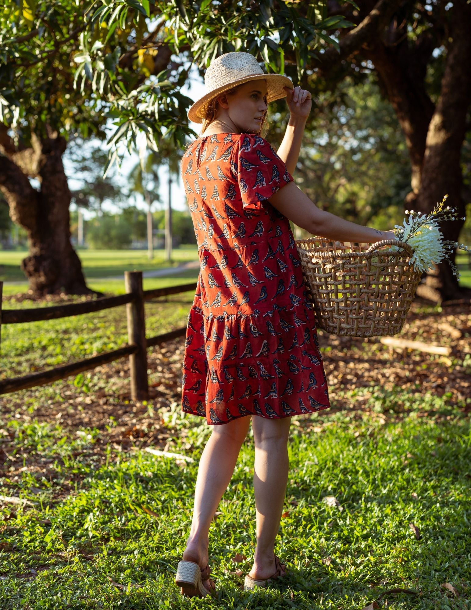 The dress features our gorgeous red bird print with a blend of natural dyes and flattering short bell sleeves. It has a comfortable and a generous fit and the dress falls just slightly above the knee length in an A-line flare layered shape.
