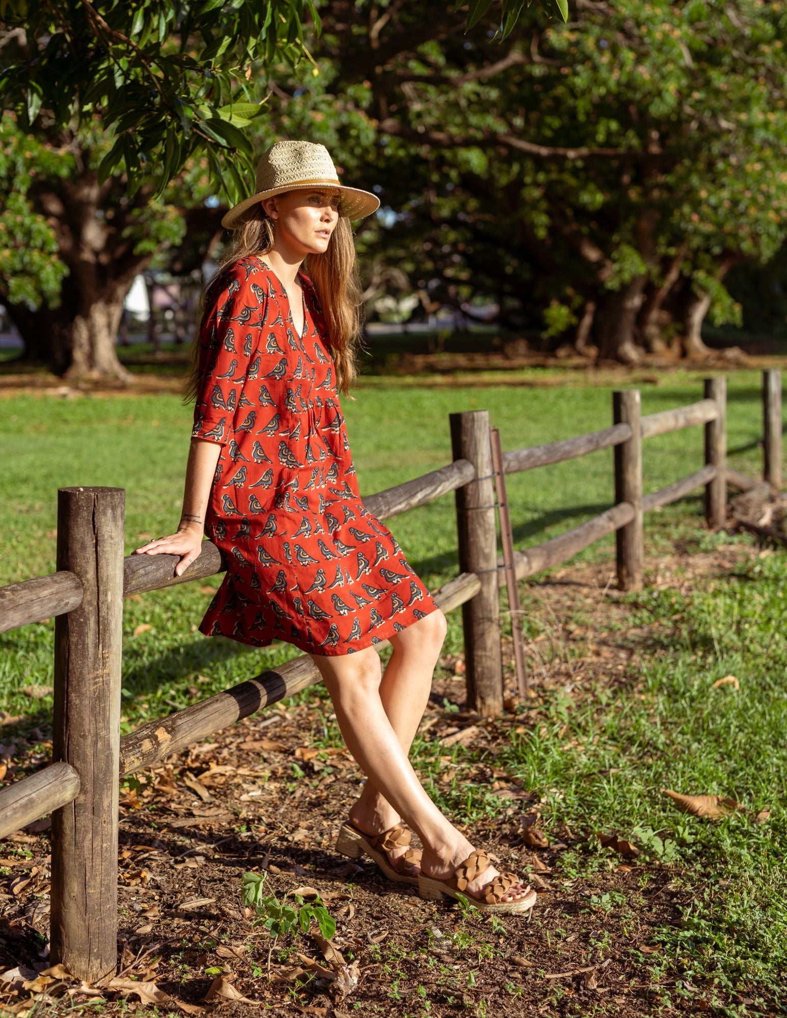 The dress features our gorgeous red bird print with a blend of natural dyes. Romanticising slightly puffed sleeves and V neck line, it falls to knee length in a flattering A-line shape.