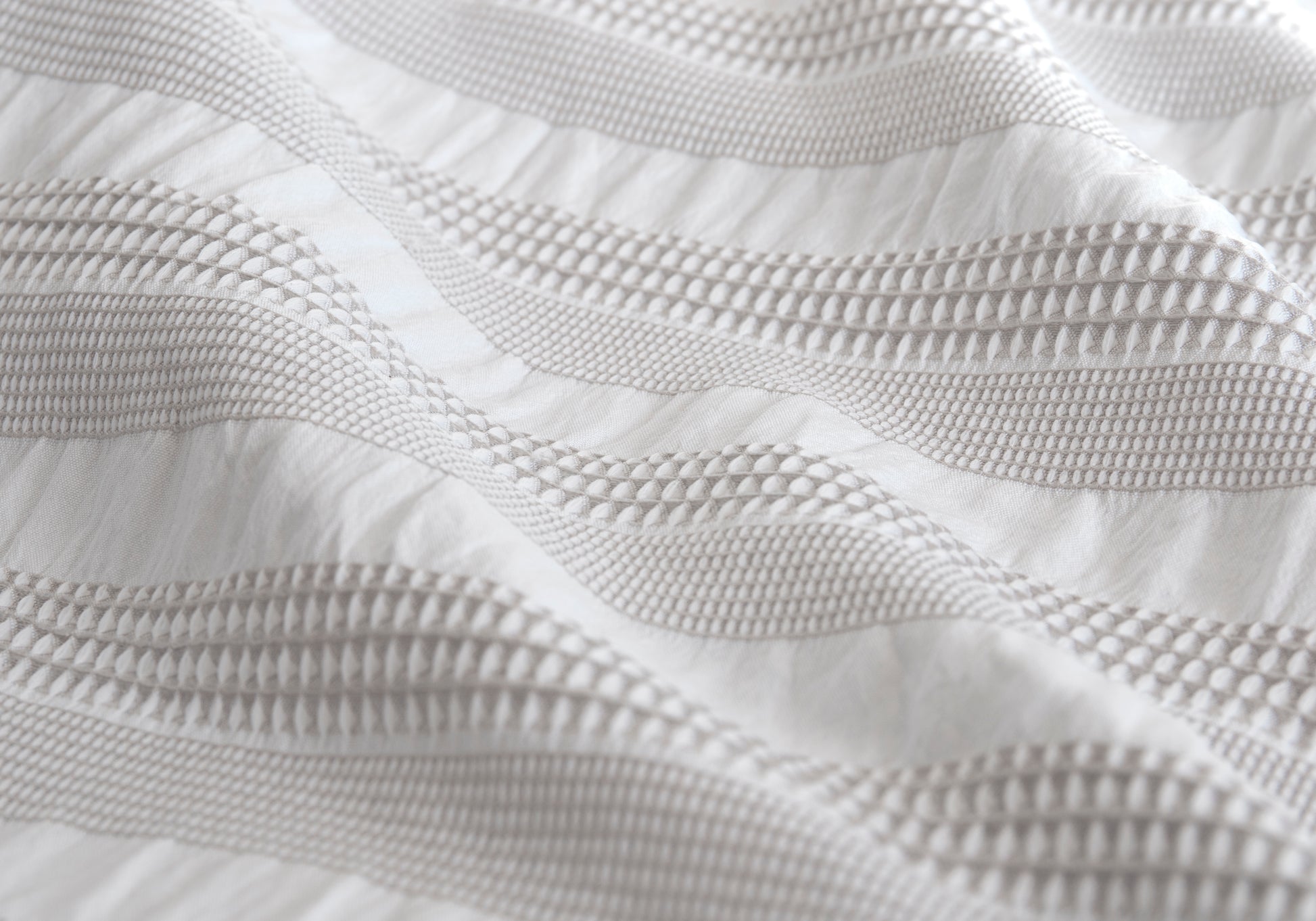 The Cove Quilt Cover Set features a textured spin on classic vertical stripes with its microfibre seersucker waffle weave. Available in Coastal grey and Chambray, balance an intriguing design with modest hues.