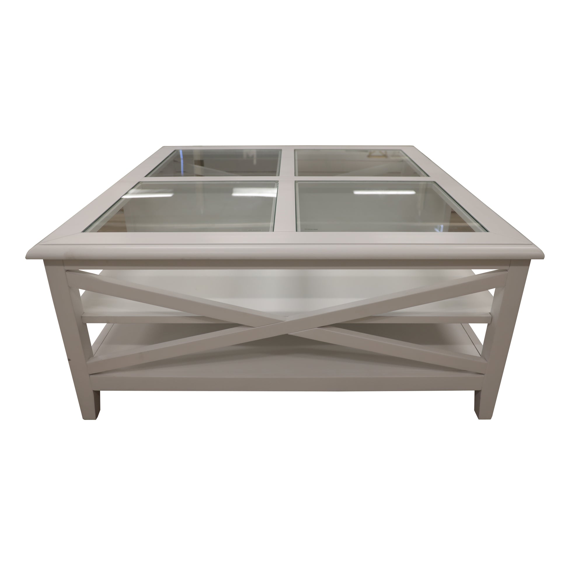 In white, this versatile coffee table is a lovely piece of furniture. It is a unique coffee table with plenty of storage space in the form of open shelves. It features 5mm tempered glass on the tabletop and cross design on both sides, that enhance its beauty. The beautiful white table is designed in the Hampton style. It has tapered legs. The table is made of high-quality Solid Acacia Wood and MDF, obtained in a sustainable manner. The wood makes the table surface silky smooth, super strong, and also resistant to moisture and extreme temperatures. A one-year warranty is included with the fully assembled coffee table.