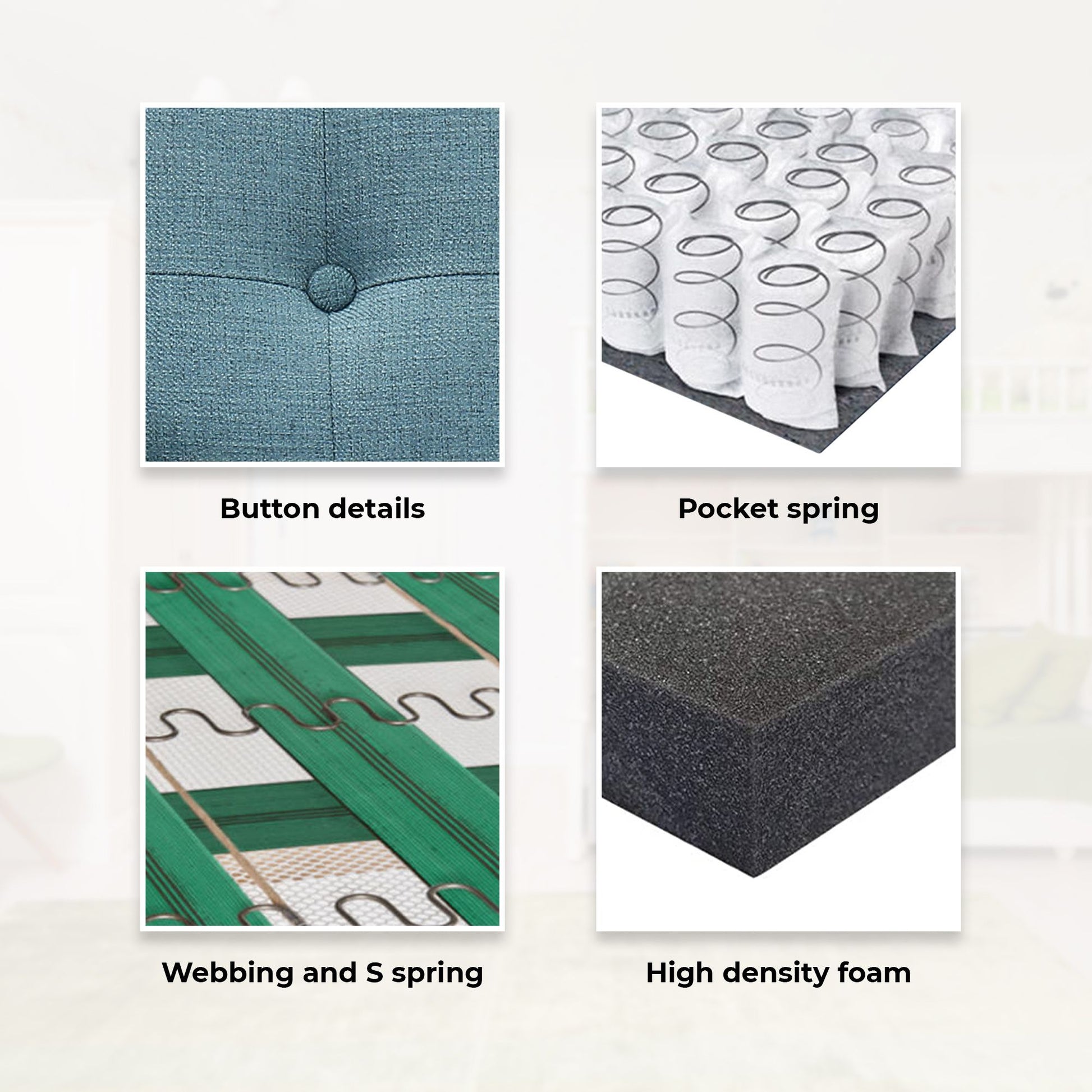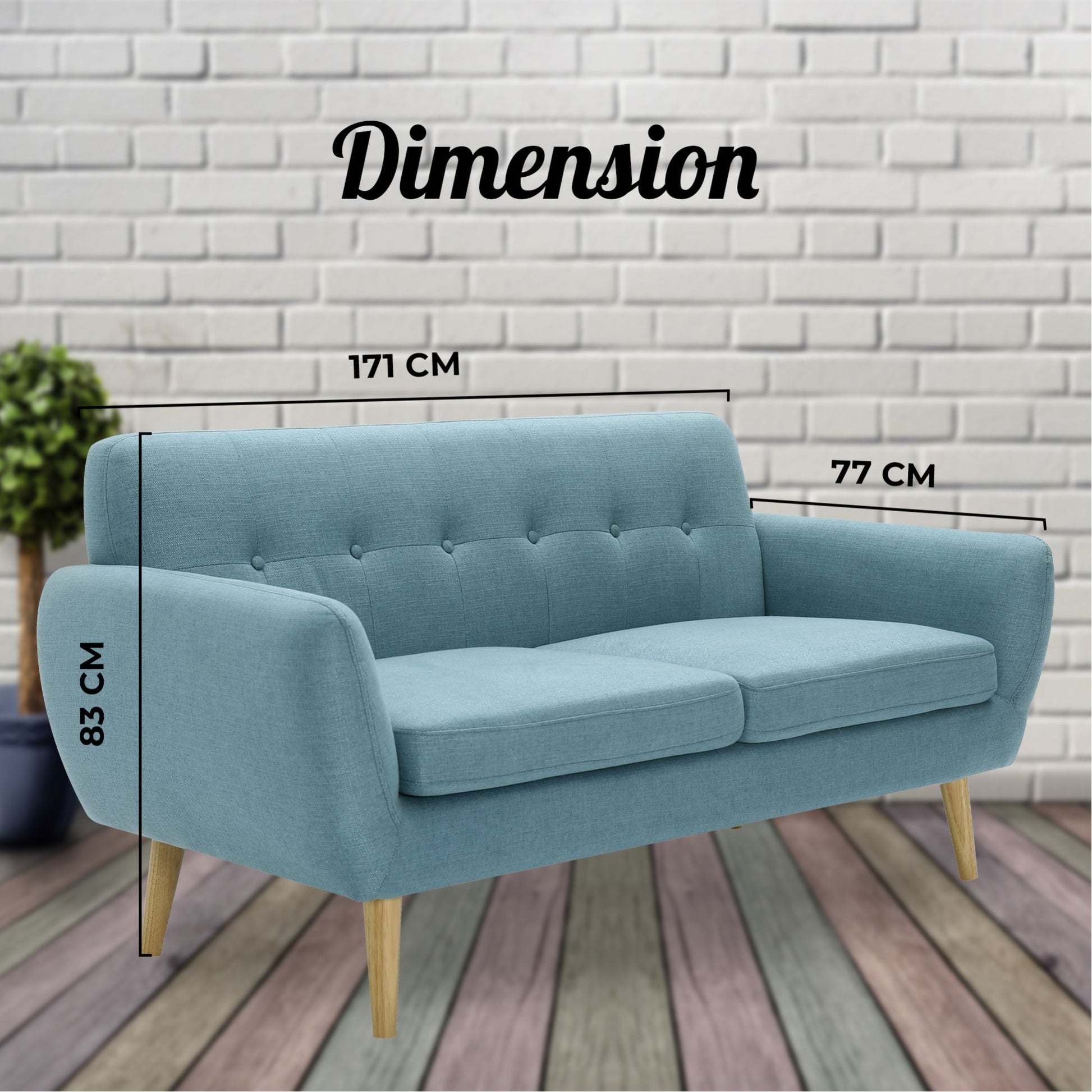 A sofa is the focal point of a living room. Place this beautiful sofa set that consists of a 1-piece 3-seater sofa and a 1-piece 2-seater sofa, designed in the Scandinavian style, in your living room to fill it with elegance. This sofa set is an epitome of superb craftsmanship. They showcase comfy looks, featuring tapered legs and outwardly sloping arms. They have a fixed backrest with button details and loose-style seat cushions with high-density foam for superior comfort. The sofas in blue mix easily with any interior decor style. The entire sofa is upholstered in 100% polyester fabric, which is soft and durable. The stunning sofas also feature high-density foam, webbing, pocket springs, and S-springs that ensure complete relaxation for the body. The structural frame of the sofa is made of sustainably harvested solid wood and plywood, which gives it internal strength and resilience. The frame has a five-year warranty; the foam and springs have a three-year warranty; the fabric and stitching have a one-year warranty; and all other parts have a one-year warranty.