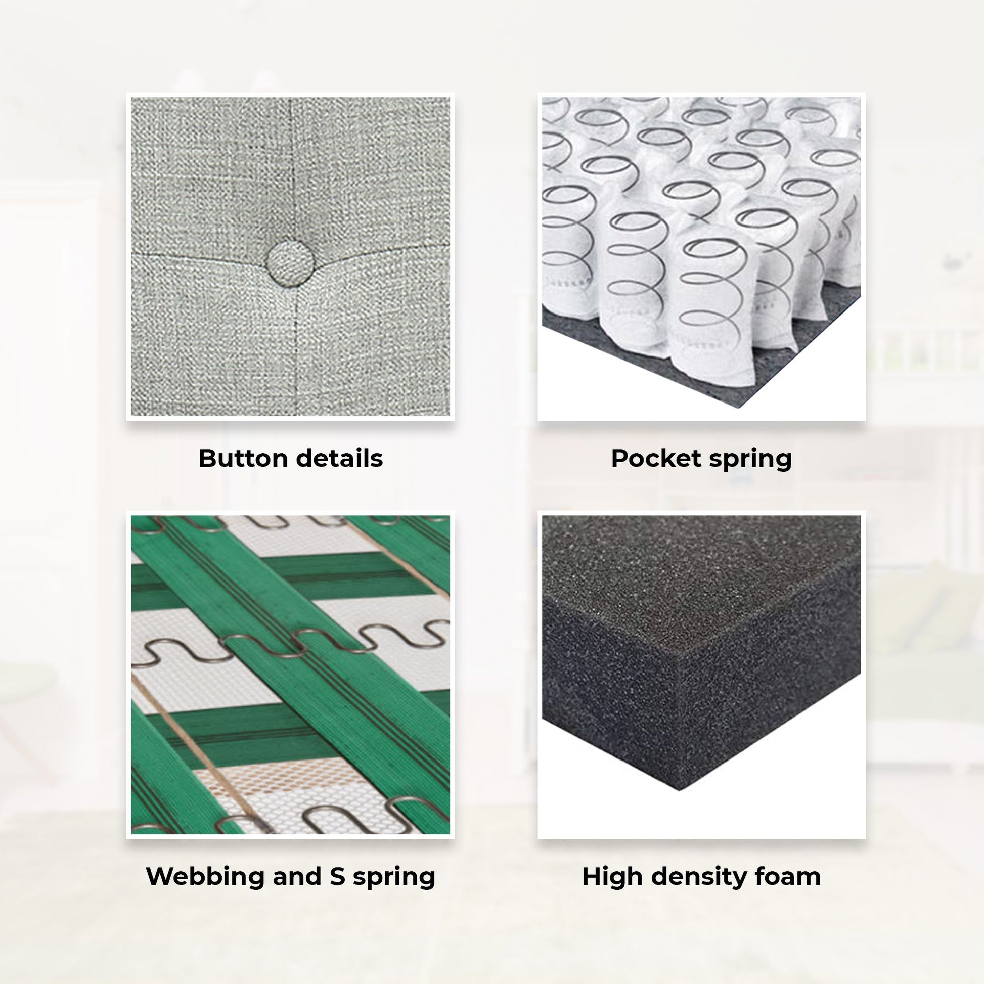 - High-density foam, webbing, pocket spring, and S-spring