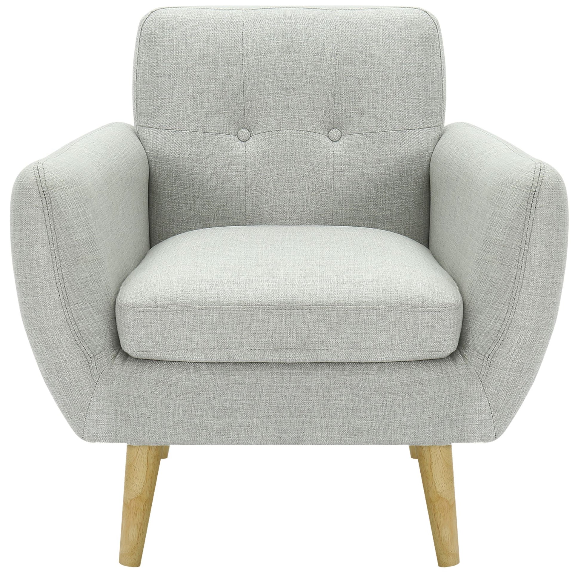 A sofa is the focal point of a living room. Place this beautiful sofa, designed in the Scandinavian style, in your living room and it will instantly become the most stylish part of your home. The single-seater sofa is an epitome of superb craftsmanship. It showcases comfy looks, featuring tapered legs and outwardly sloping arms. It has a fixed backrest with button details and loose-style seat cushions with high-density foam for superior comfort. The arm chair in light grey mixes easily with any interior decor style. The entire sofa is upholstered in 100% polyester fabric, which is soft and durable. The stunning sofa also features high-density foam, webbing, pocket springs, and S-springs that ensure complete relaxation for the body. The structural frame of the sofa is made of sustainably harvested solid wood and plywood, which gives it internal strength and resilience. The frame has a five-year warranty; the foam and springs have a three-year warranty; the fabric and stitching have a one-year warranty; and all other parts have a one-year warranty.