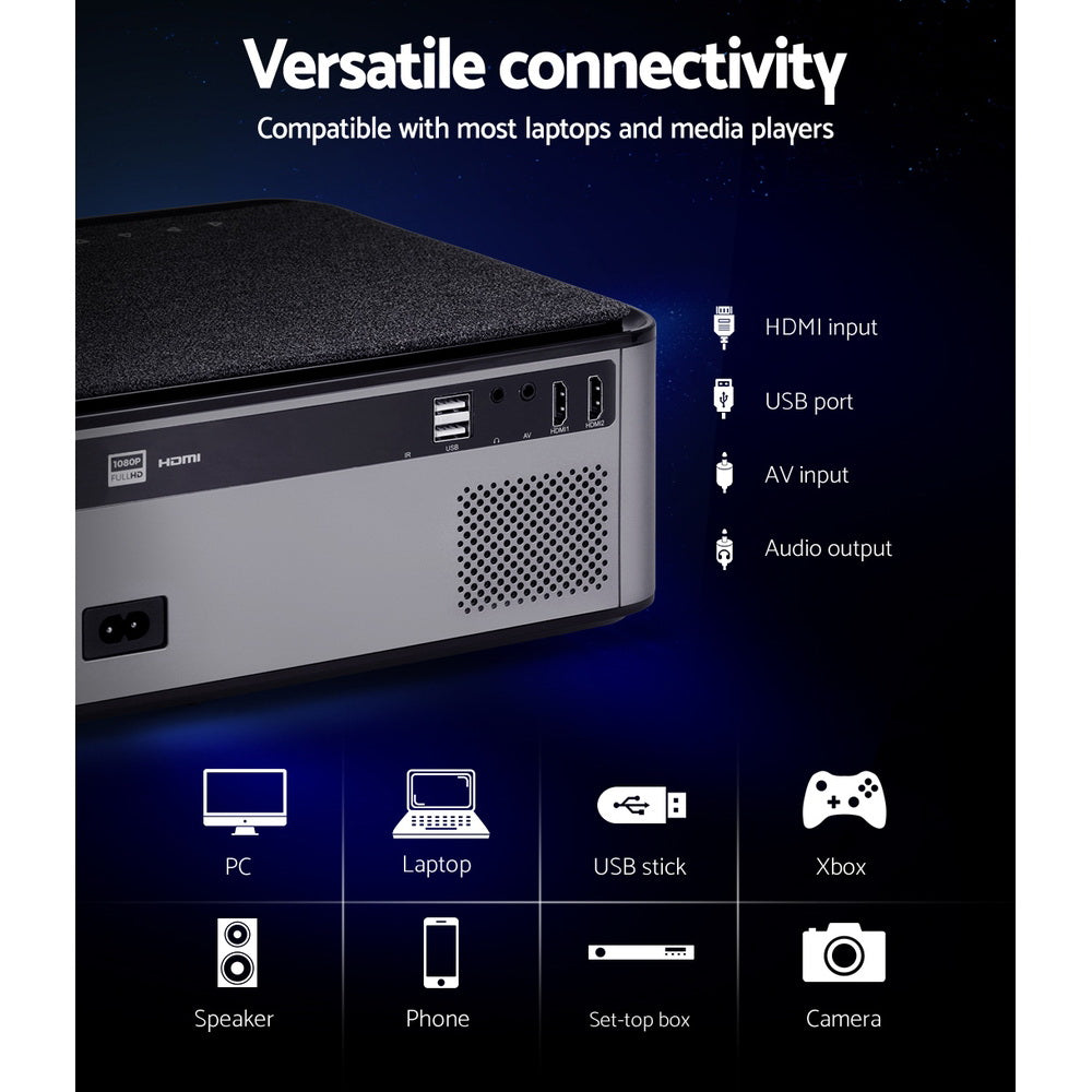 From the small screen to the big screen, now you can enjoy epic entertainment with our Devanti Video Projector. With its ultra-expansive colour gamut, the projector delivers crisp clear images with more brilliant colours to give you the best projection experience. The projector is fully 1080p compatible, so you won’t have to compromise on quality. Using Wi-Fi connectivity, our video projector supports screencasting from your iPhone, iPad, smartphone, tablet or laptop, so you can stream your favourite content effortlessly. It also features a built-in heavy bass speaker and a high-lumens lamp with a lifespan of up to 50,000 hours. For even more entertainment value, the projector includes HDMI, USB, AV and 3.5mm audio ports for fast connection to multiple devices such as external speakers, game consoles and hard disks. Get the home cinema experience and order today! Includes remote control and additional AV audio cable.