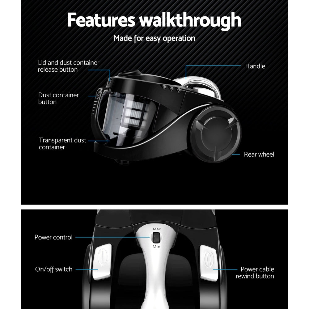 Devanti Vacuum Cleaner Bagless Cyclone Cyclonic Vac Home Office Car 2200W Black
