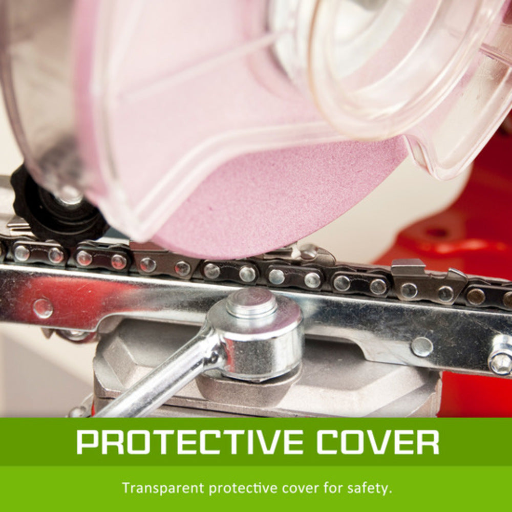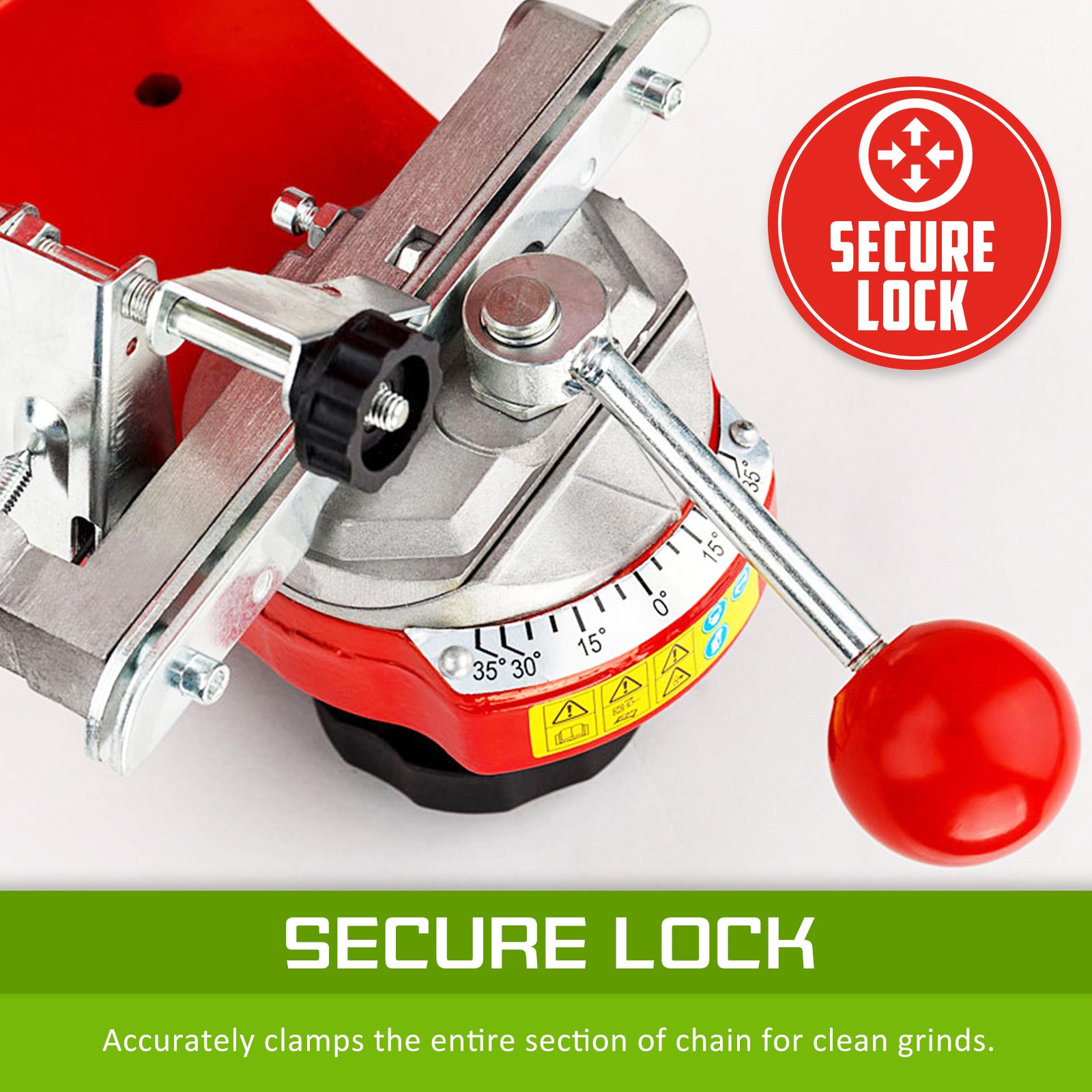 This is a precision chain saw grinder giving accurate sharpening of each chain saw tooth, every tooth will be the same length and correct angle. This grinder makes chain saw sharpening so easy giving your chain saw a professional result. It now comes with the new SECURE-LOCK feature which accurately clamps the entire section of chain for superior clean grinds.